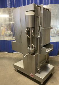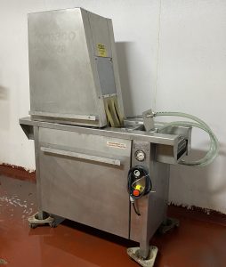 FOMACO FGM 20/40 Pickle Injector. 10″ wide plastic conveyor belt. Set up with 20 double needles. 1.1 kW conveyor drive motor. 2.5 kW Jabsco PFLO brine pump motor. 31 l/minute. 220V/3PH/60HZ, 5.3 Amps.