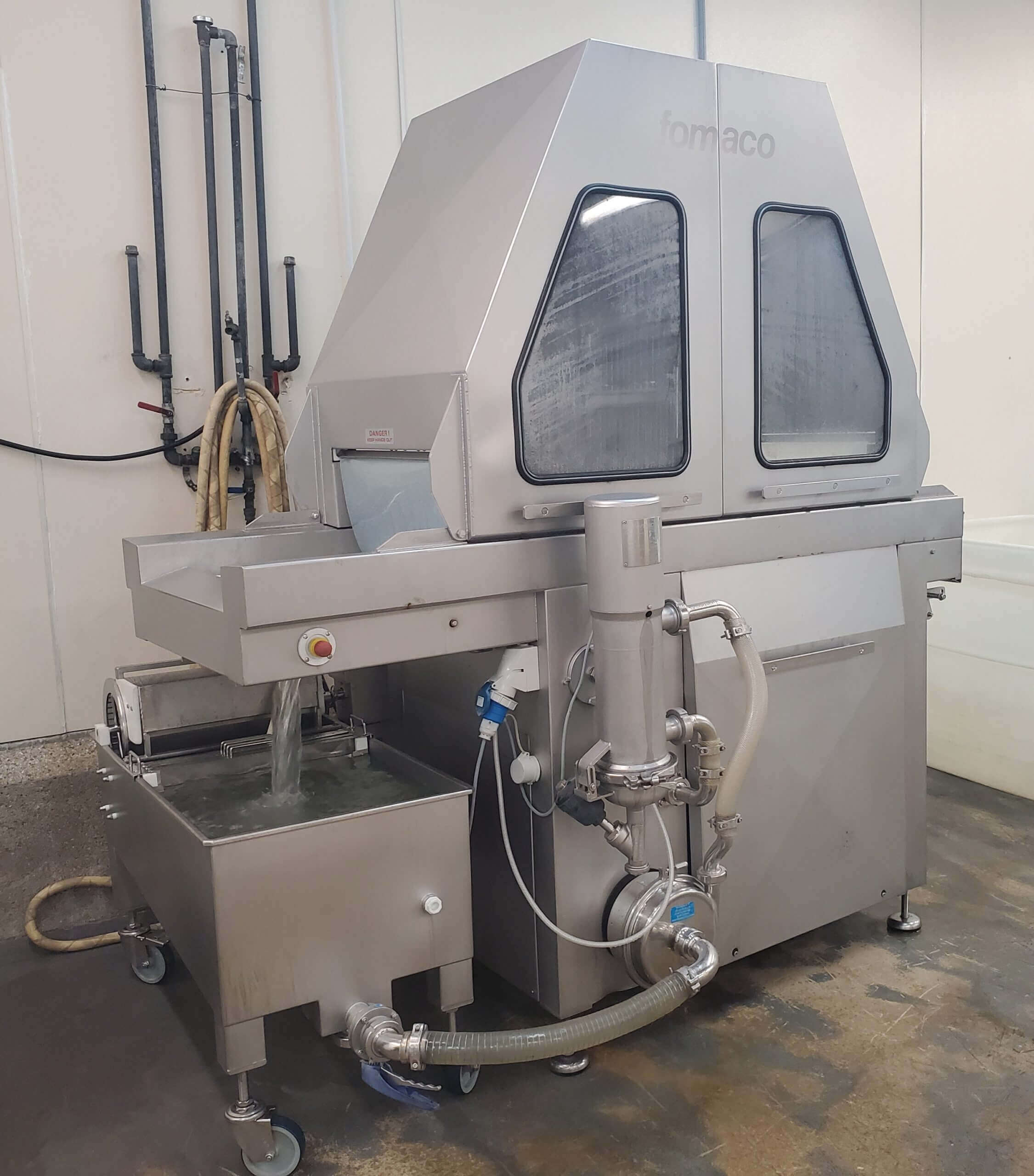 Fomaco FGM44 M2 Pickle Injector. All stainless steel construction, F 80 self cleaning protein filter, 575mm wide plastic conveyor belt. 230mm maximum product height, up to 20 to 90 strokes per minute, multiple conveyor speeds, includes rotary brine filter, 220V/3PH/60HZ.