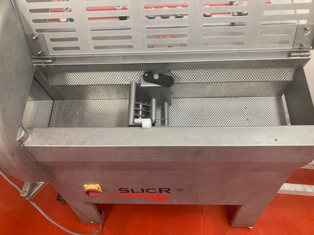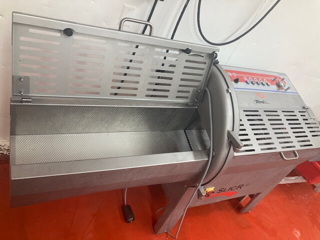 TREIF Zebra CE Slicer. Setup for 1/8″ slice thickness, minimum product temp. 2...