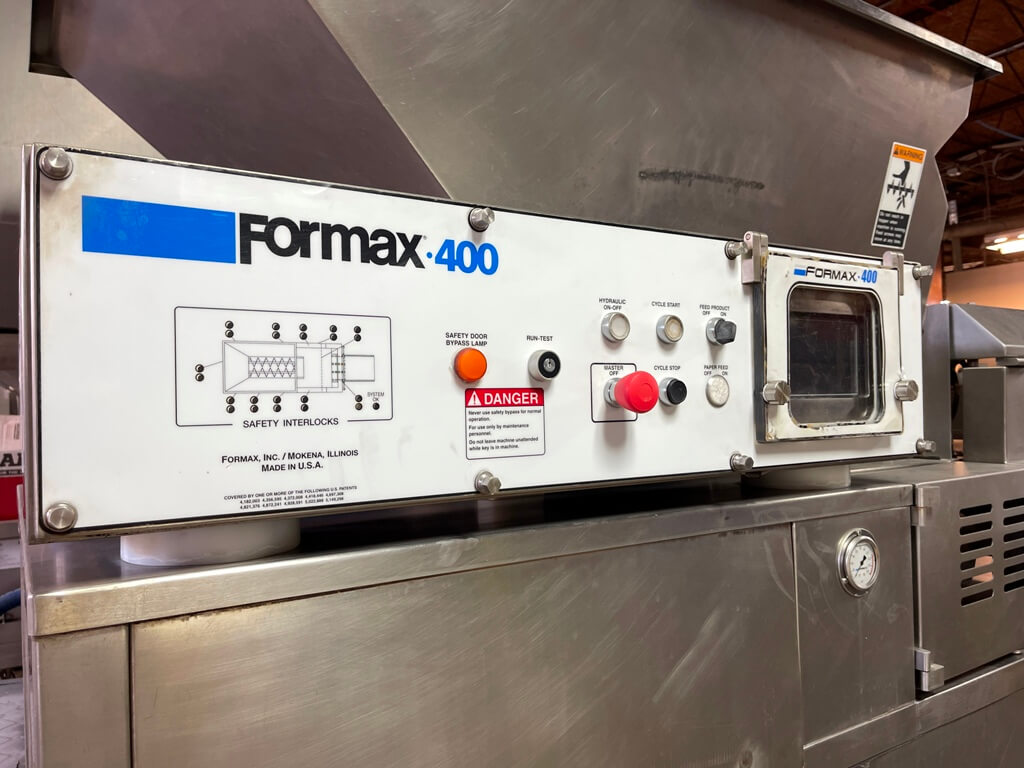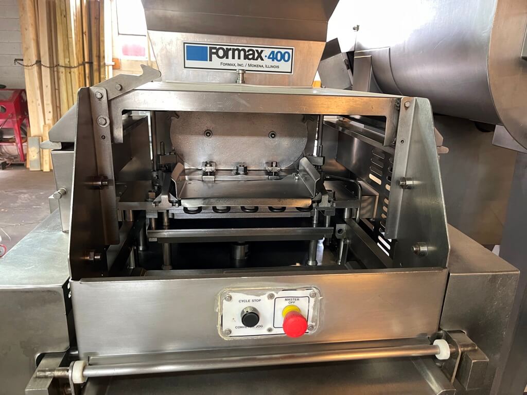Formax F 400 Forming Machine. Set up to run Standard and Tenderform fill systems.15-3/4″ usable product width. 500# hopper capacity, up to 70 strokes per minute. PLC controls. 7.5 hp mold plate drive motor. 10 hp hydraulic compression system. 440V/3PH/60HZ. Note: Does not have paper feed system.