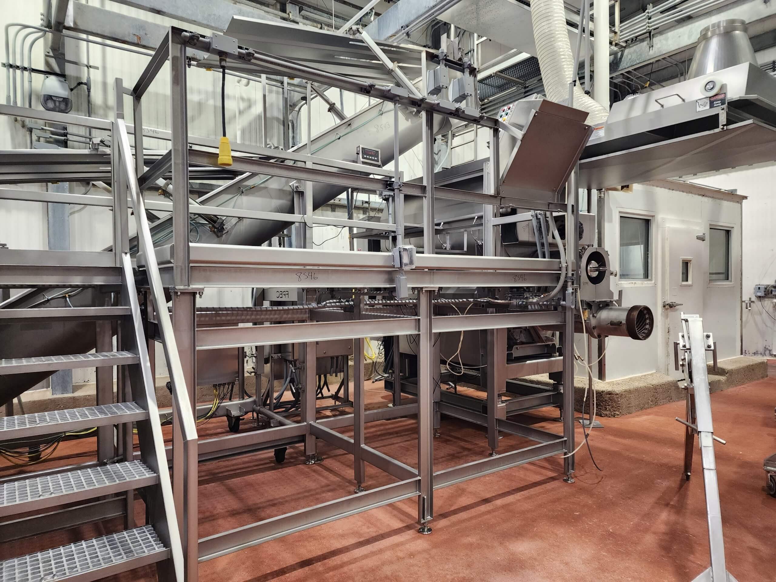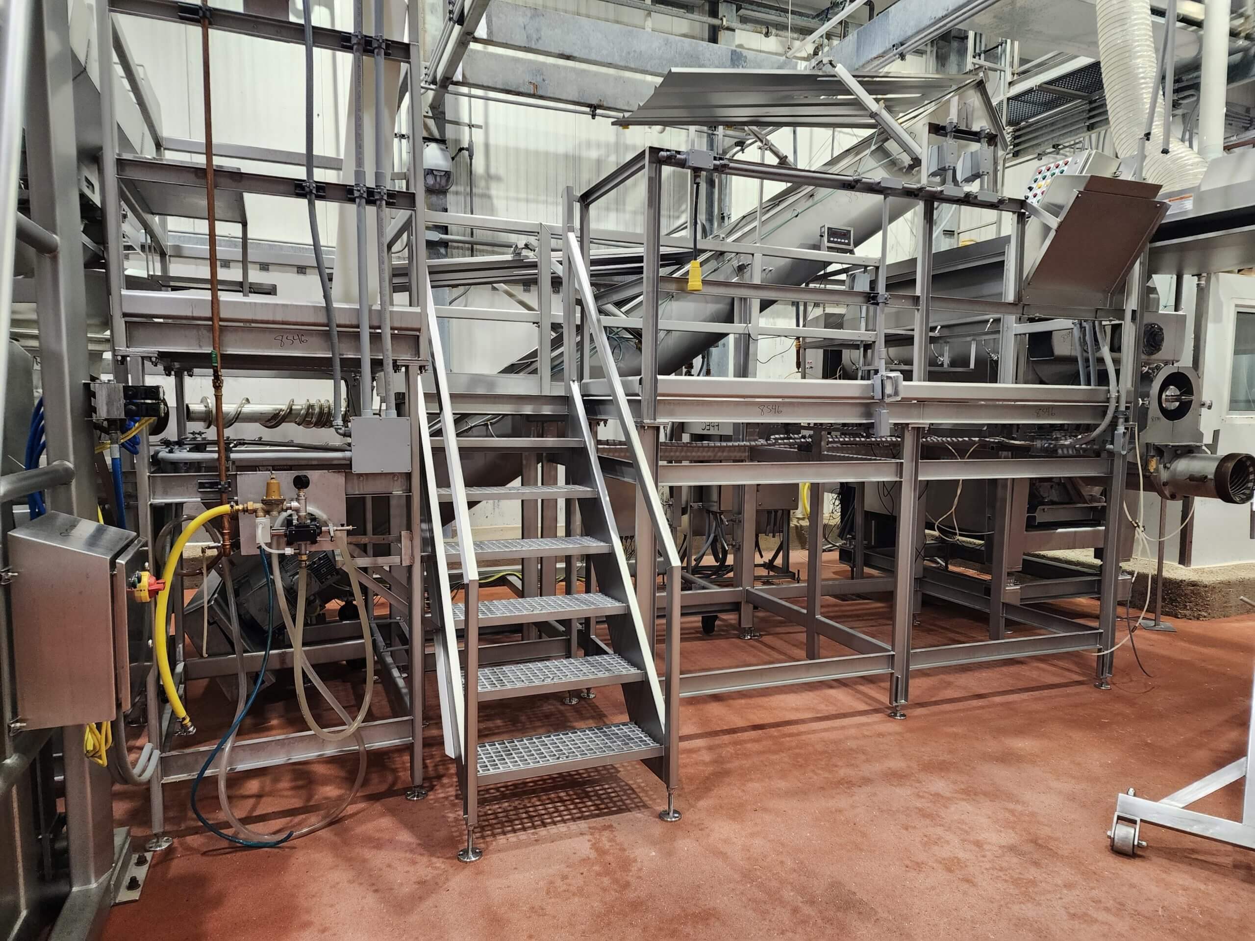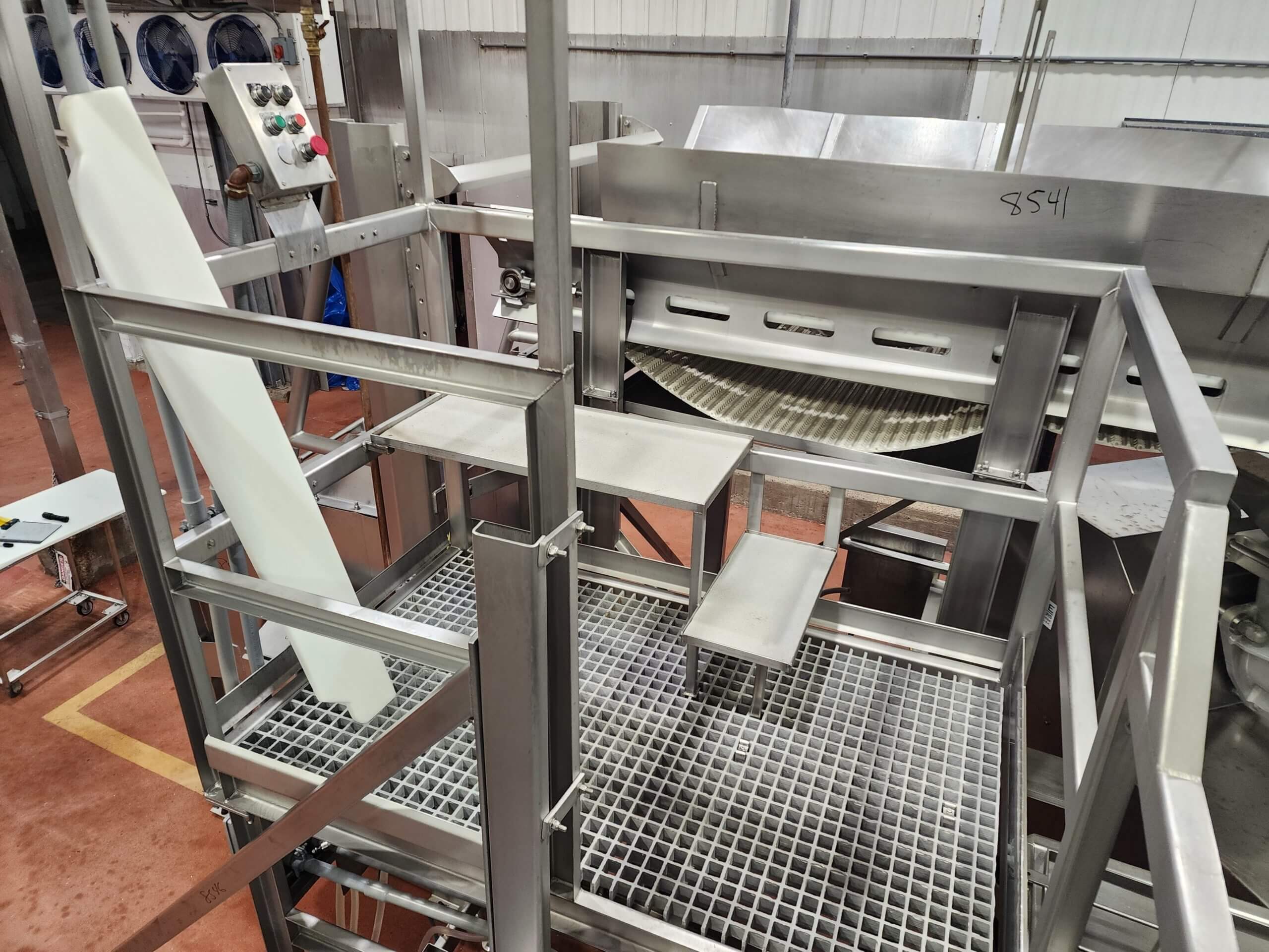 FPEC 145 Work Platform. All stainless steel worker platform. 13′ long x 7’5″ wide x 5’5″ tall mezzanine. Includes 9′ tall hand rails, (1) set of entrance & exit stairs for the work area.