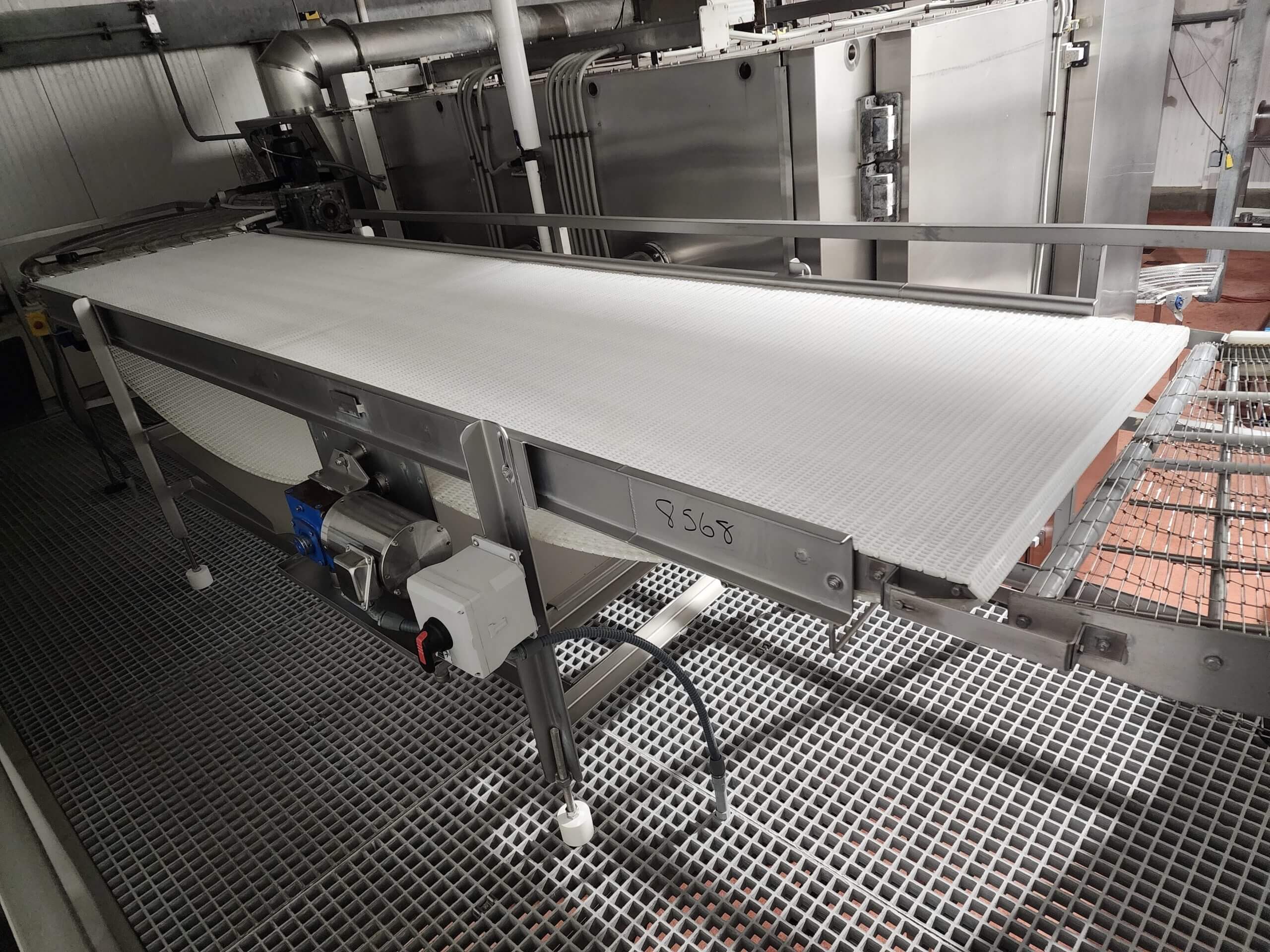 CUSTOM STAINLESS Transfer Conveyor. 17.5″ wide x 84″ long plastic convey...