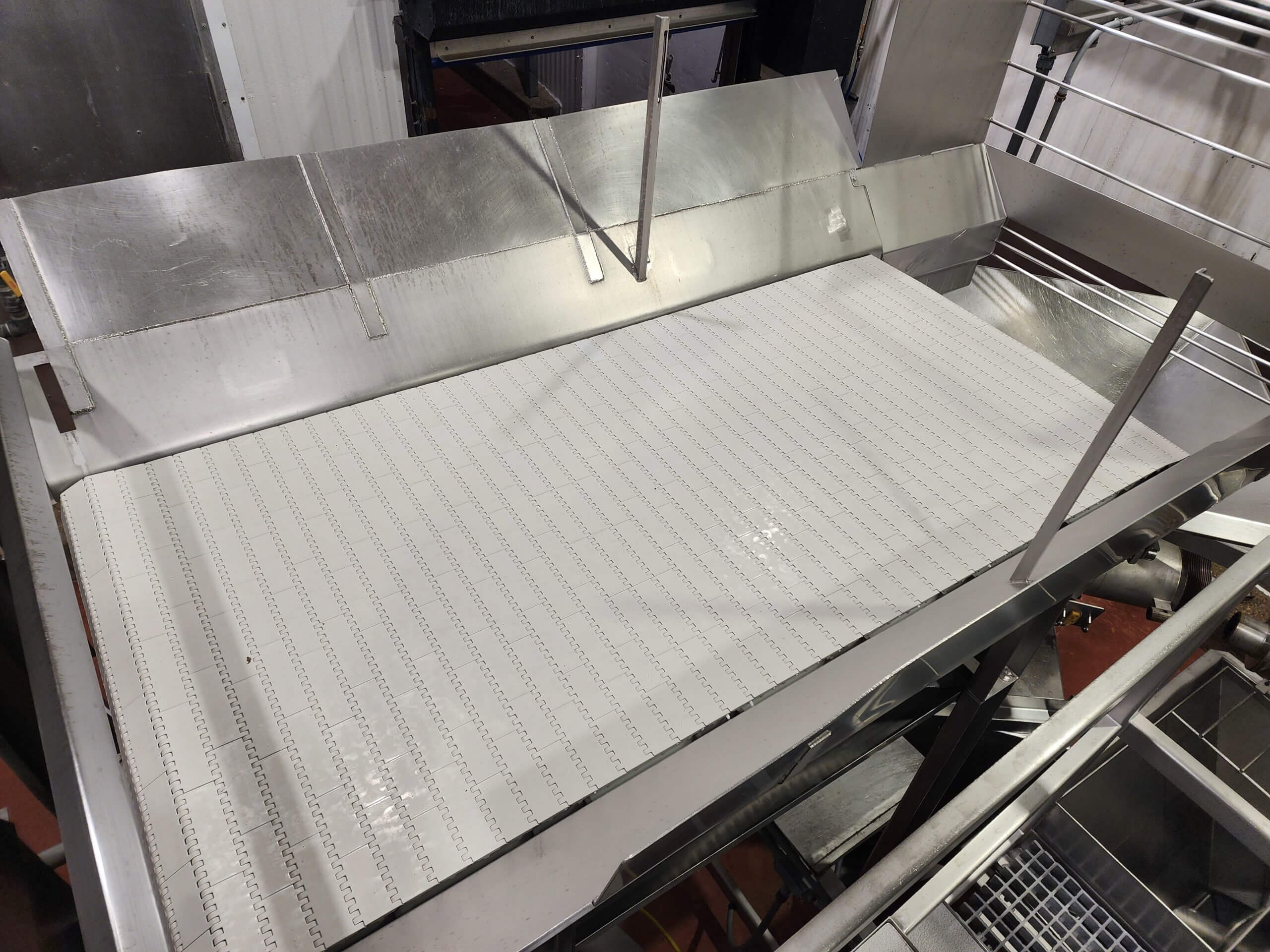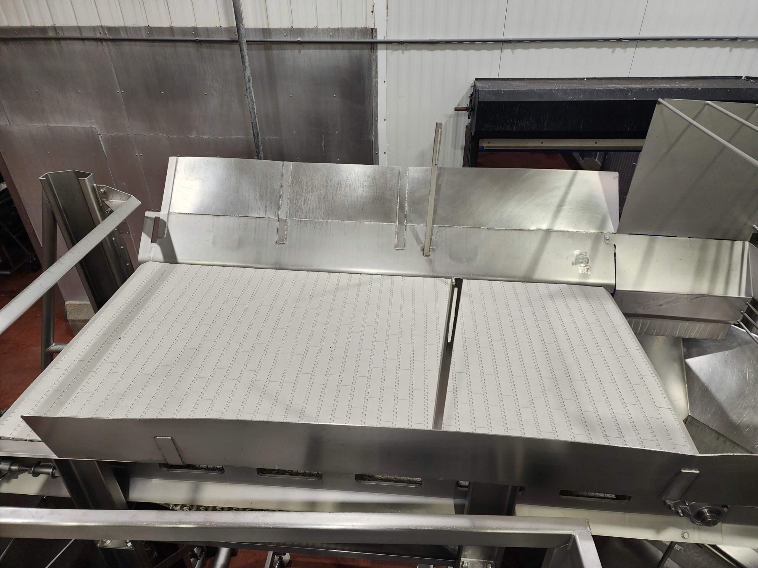 Kleenline Pack Off Conveyor. Twin conveyors: Top 12″ wide plastic conveyor bel...