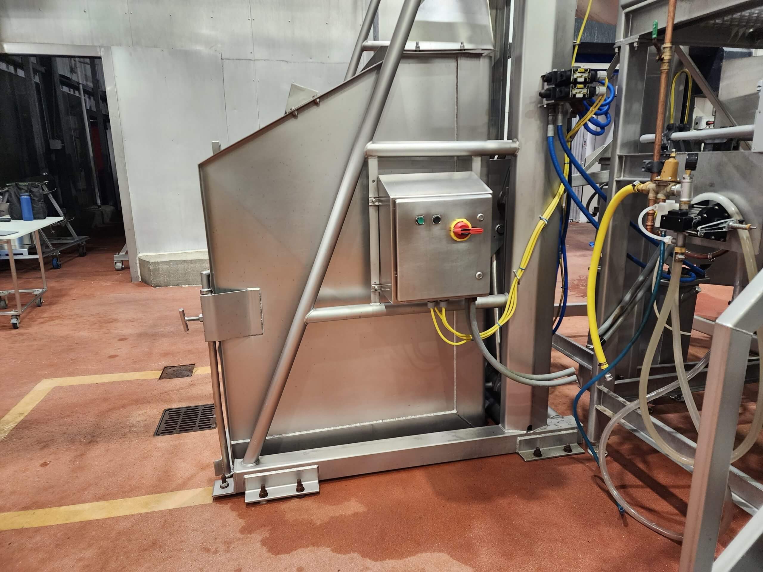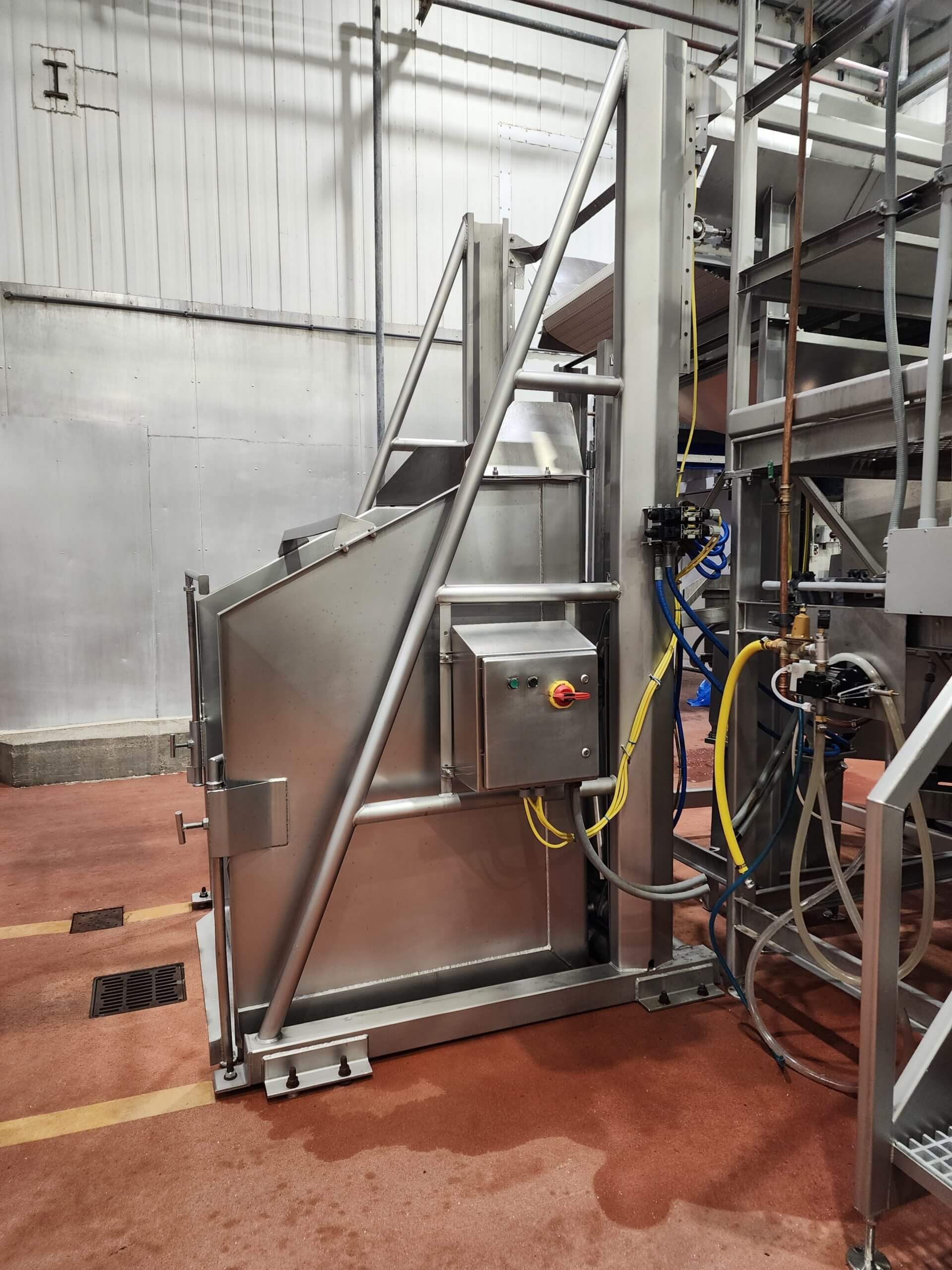 FPEC HLD 725 Vat Dumper. High lift Vat Dumper, all stainless steel construction. Adjustable Dump height from 86″ to 120″, 48″ wide x 45″ deep bed, adjustable hold down bar from 36″ to 58″, hydraulic lift cylinders. Includes Hydraulic power pack. 460V/3PH/60HZ.