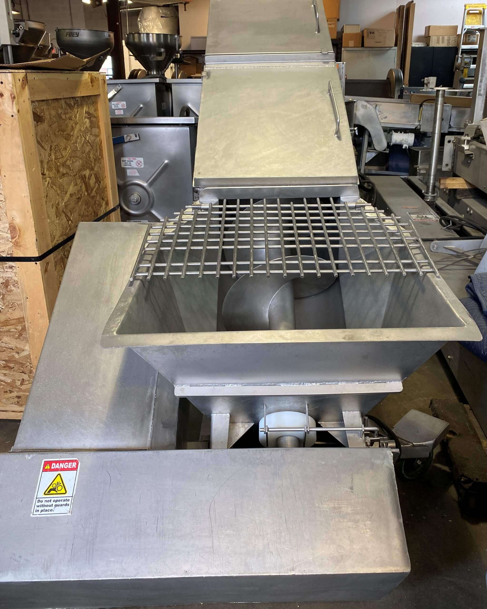 FPEC Incline Screw Conveyor. All stainless steel construction. Recently reconditioned and ready to ship machine. 16″ diameter auger x 15′ long. 28″ x 28″ in feed hopper. 86″ discharge height. (4) sections full hinged safety covers, mounted on a portable base. 7.5hp TEFC drive motor. 220/440V/3PH/60HZ.