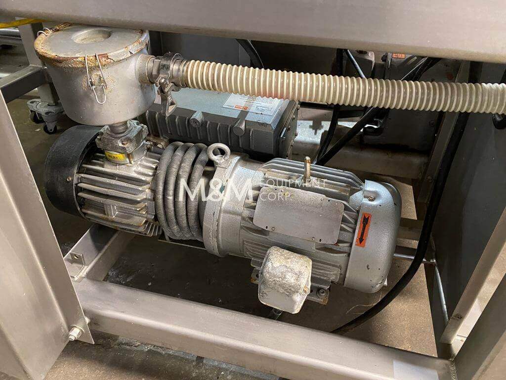 FPEC Continuous Vacuum Tumbler. 2,200 lb capacity. Front door loading and discharge. Side mounted control panel. Includes 48″ x 36″ x 30″ FPEC vacuum fill hopper on casters with 6″ bottom discharge port. Busch RA0100 Vacuum Pump. 2 hp drive motor. 220V/3PH/60HZ.