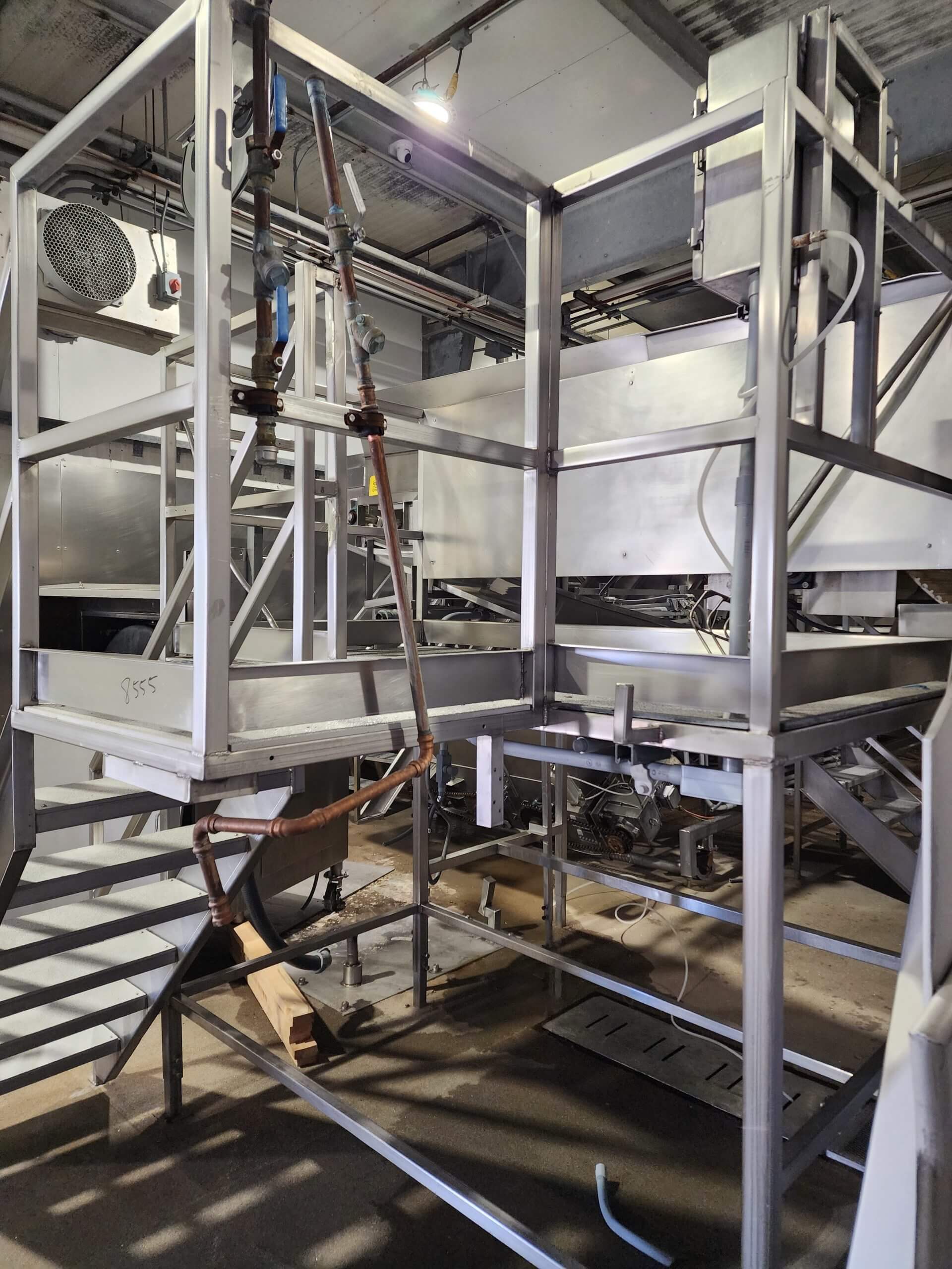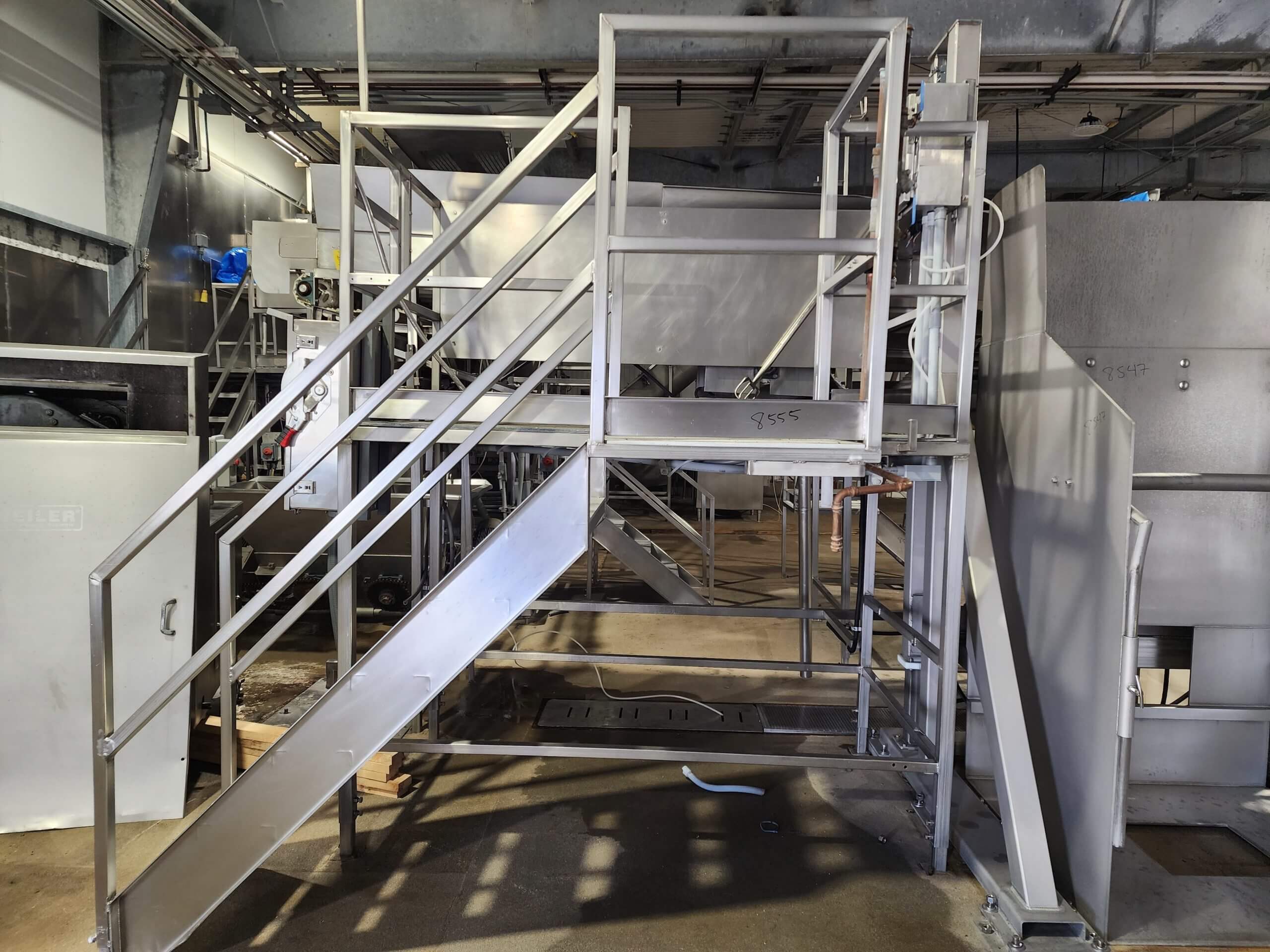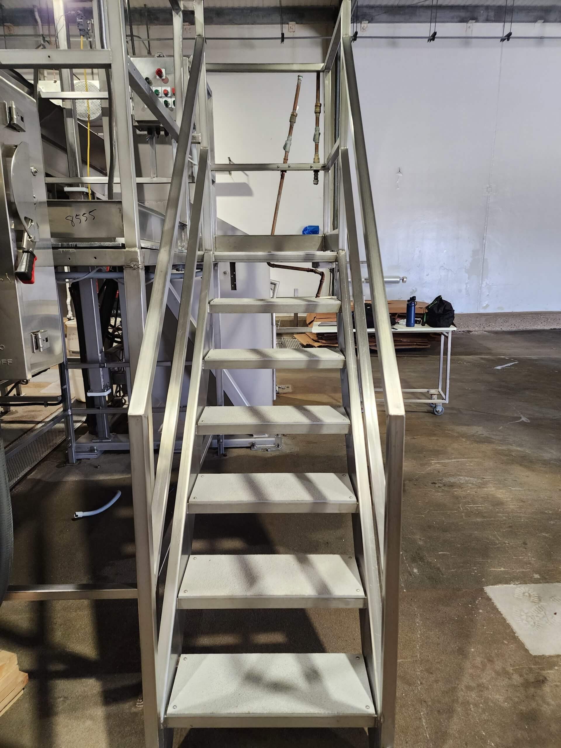 FPEC Work Platform. All stainless steel worker platform. 6’5″ long x 7’5″ wide x 5’5″ tall mezzanine. Includes 9′ tall handrails, with entrance & exit stairs for the work area.