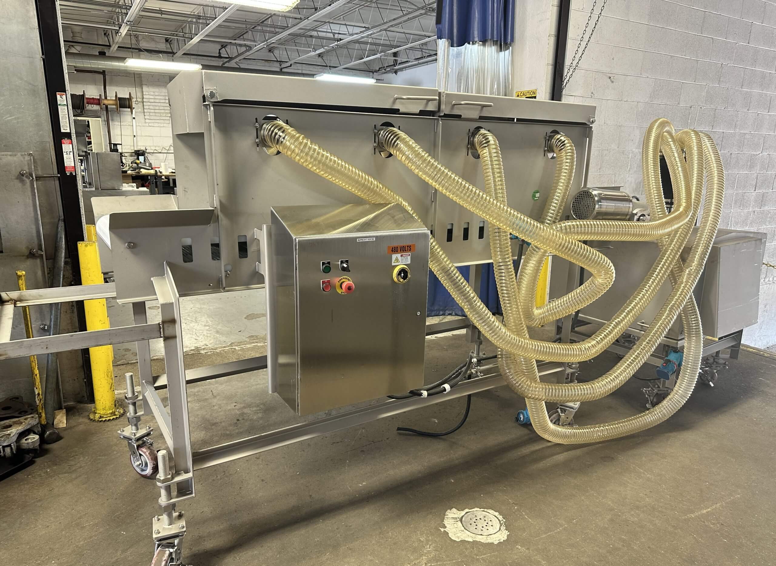 Friensen Air Blow Off Conveyor. 8′ long x 18″ wide Intralox 2400 flush grid white conveyor belt. (4) independent top mounted Paxton air knives with separate air blower system. Stainless steel Keltech motor and reducer, complete with controls. 480V/3PH/60HZ. Mounted on stainless steel swivel casters with controls.