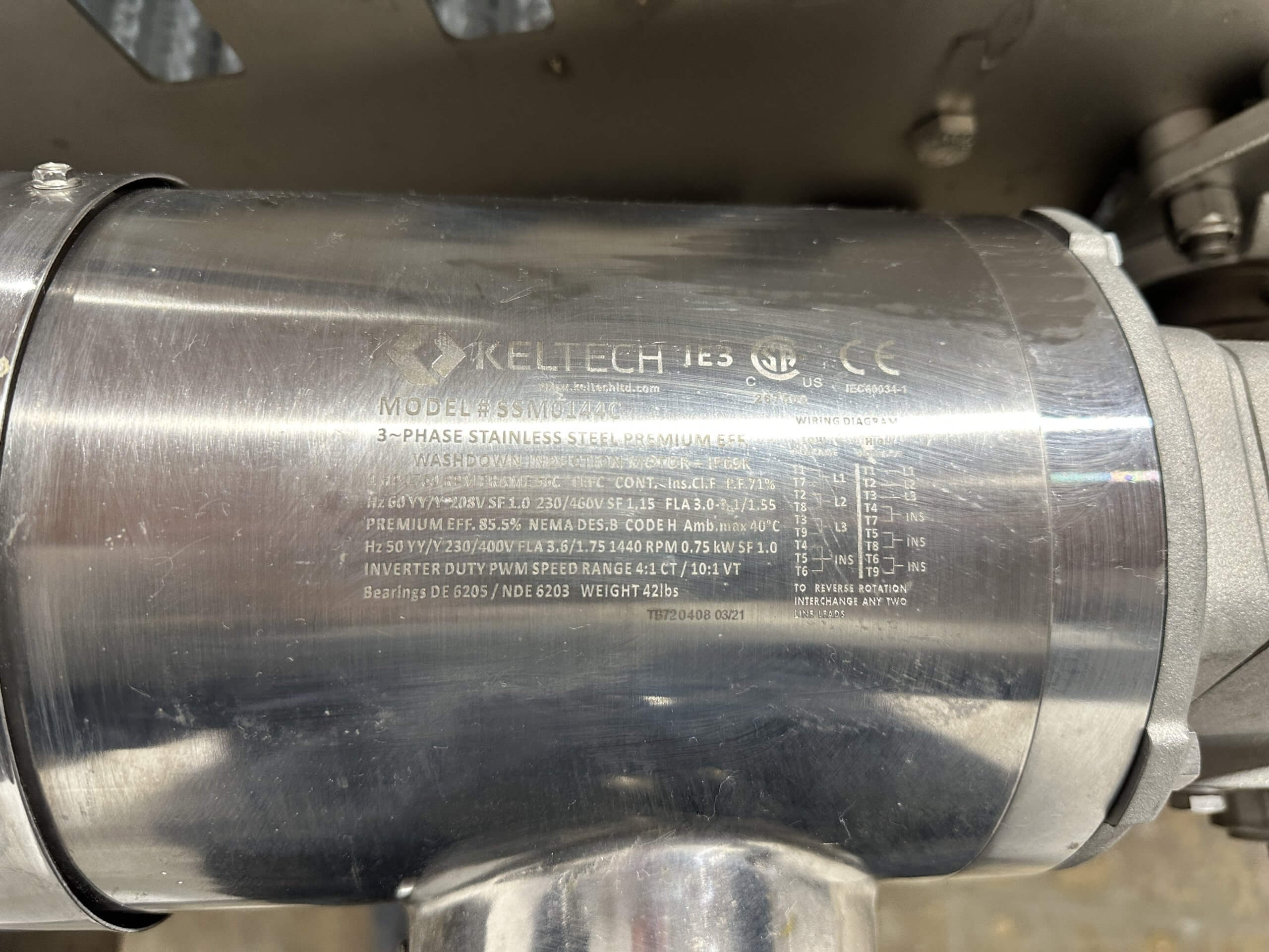 Friesens Transfer Conveyor. 42″ wide plastic conveyor belt, 19′ long, 26″ infeed, 55″ discharge, with controls, adjustable legs with casters. Keltech 1hp stainless steel inverter duty motor with Dodge 60:1 gearbox. 480V/3PH/60Hz.