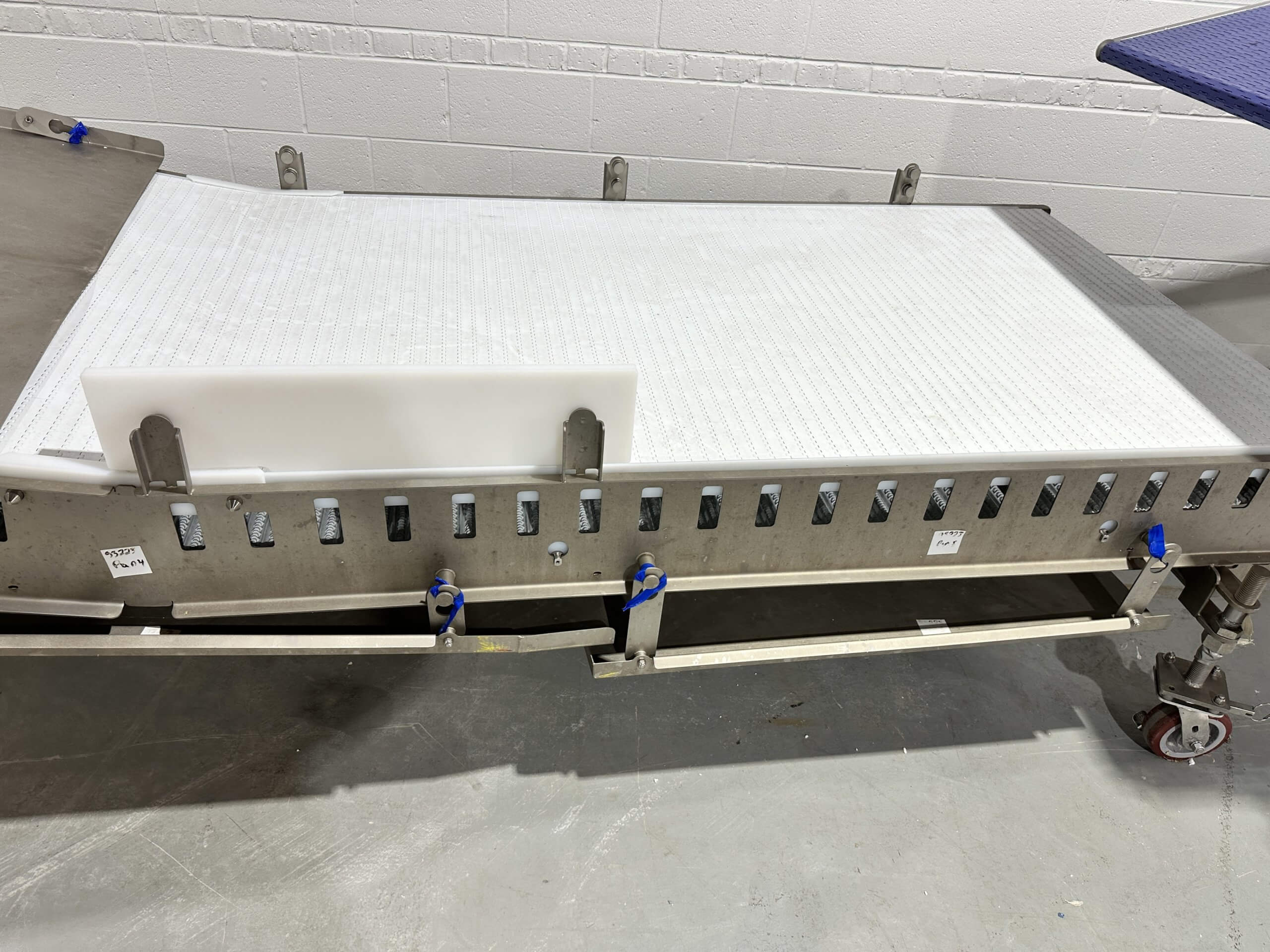 CUSTOM STAINLESS Transfer Conveyor. 18″ x 59″ plastic conveyor belt. Sta...