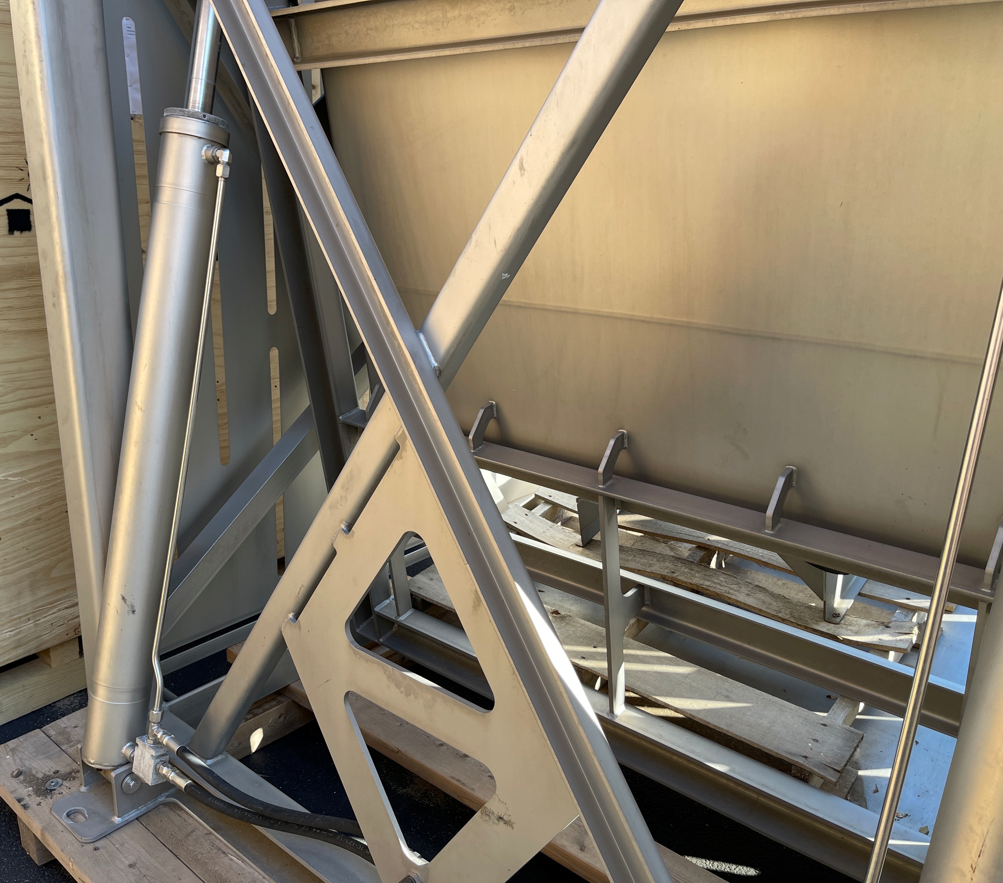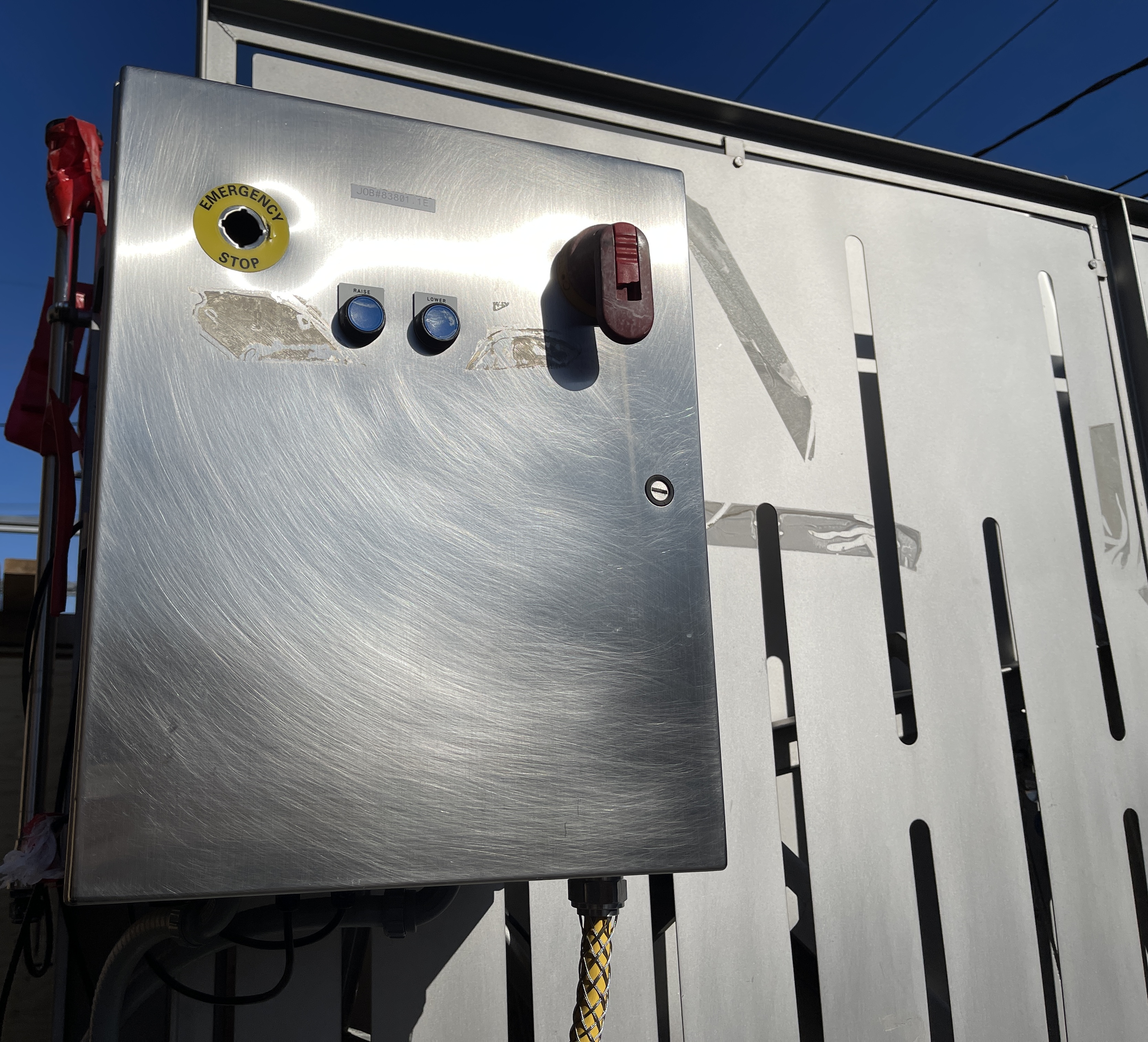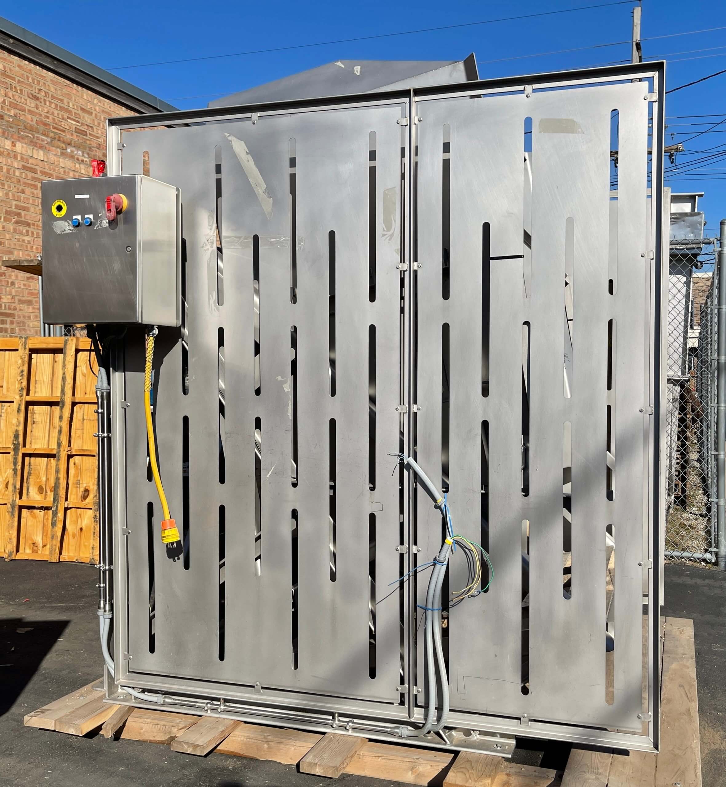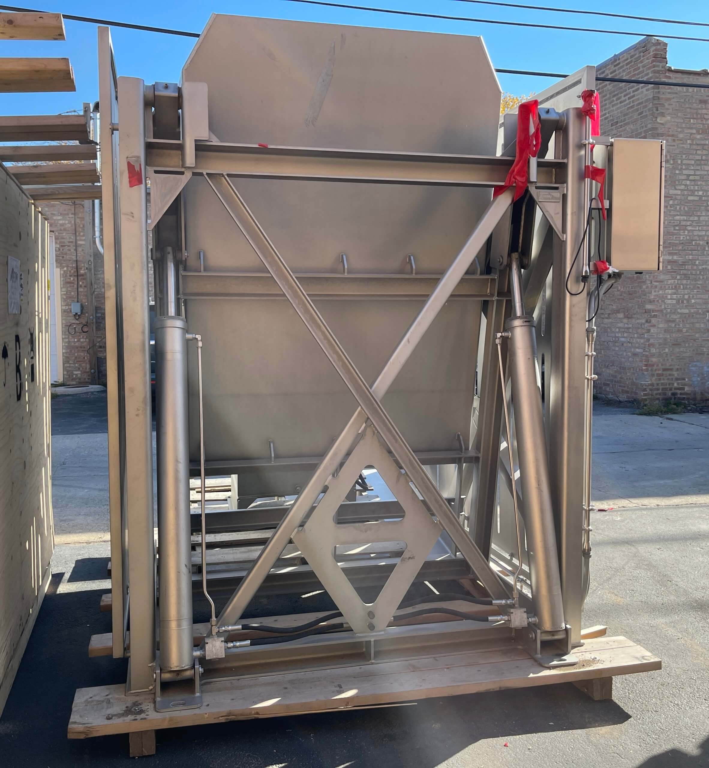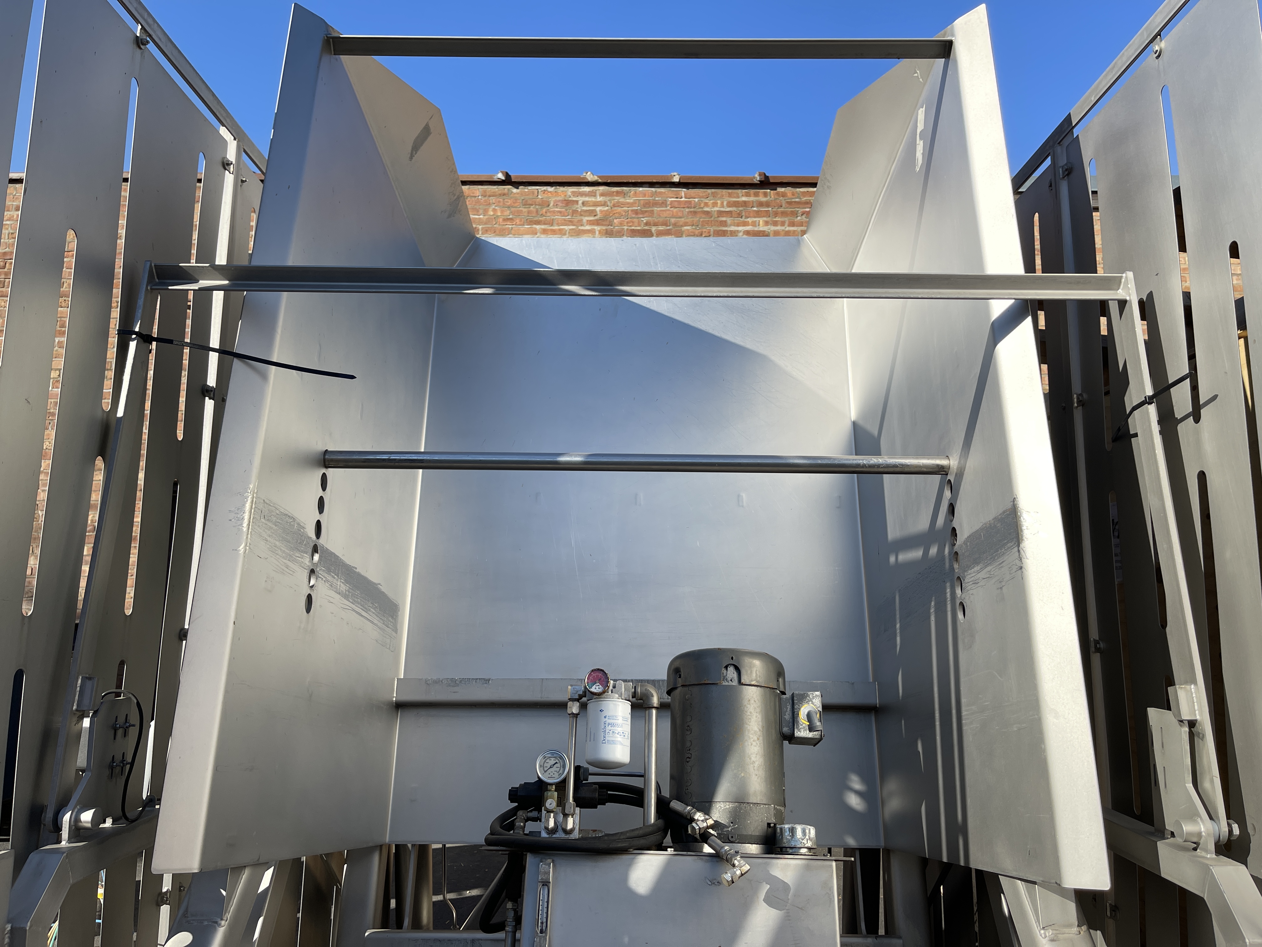 Friesens Vat Dumper SC. 51″ X 52″ platform, 79″ pivot point, adjustable down bar from 40″ to 52″, Dual 5″ stainless steel cylinders. Includes hydraulic power pack with 7.5 hp motor, 230/460V/3PH/60HZ. Includes controls.