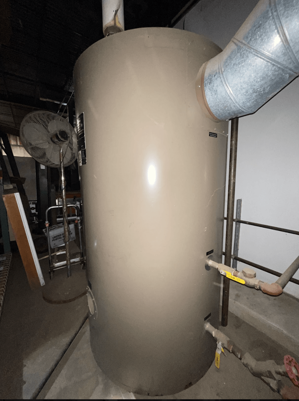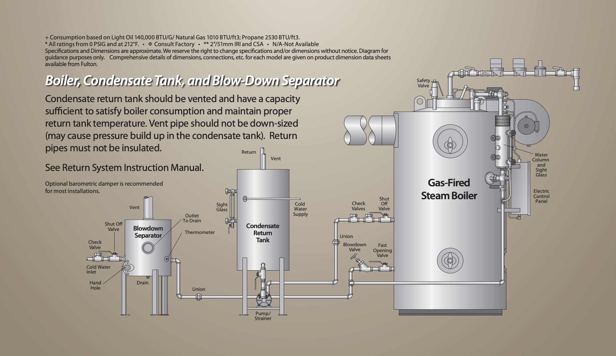 Fulton ICS 30 Vertical Tubeless Boiler. 170-gallon capacity, 3/4 hp burner motor, MWP 15 PSI, maximum firing rate 1,260,000 BTU, 1035 Lbs. Steam/hr., natural gas-fired. Includes Consolidate return tank and Blowdown Separator. Boiler OD: 93″ tall x 46″ dia. Removal and loading are additional.