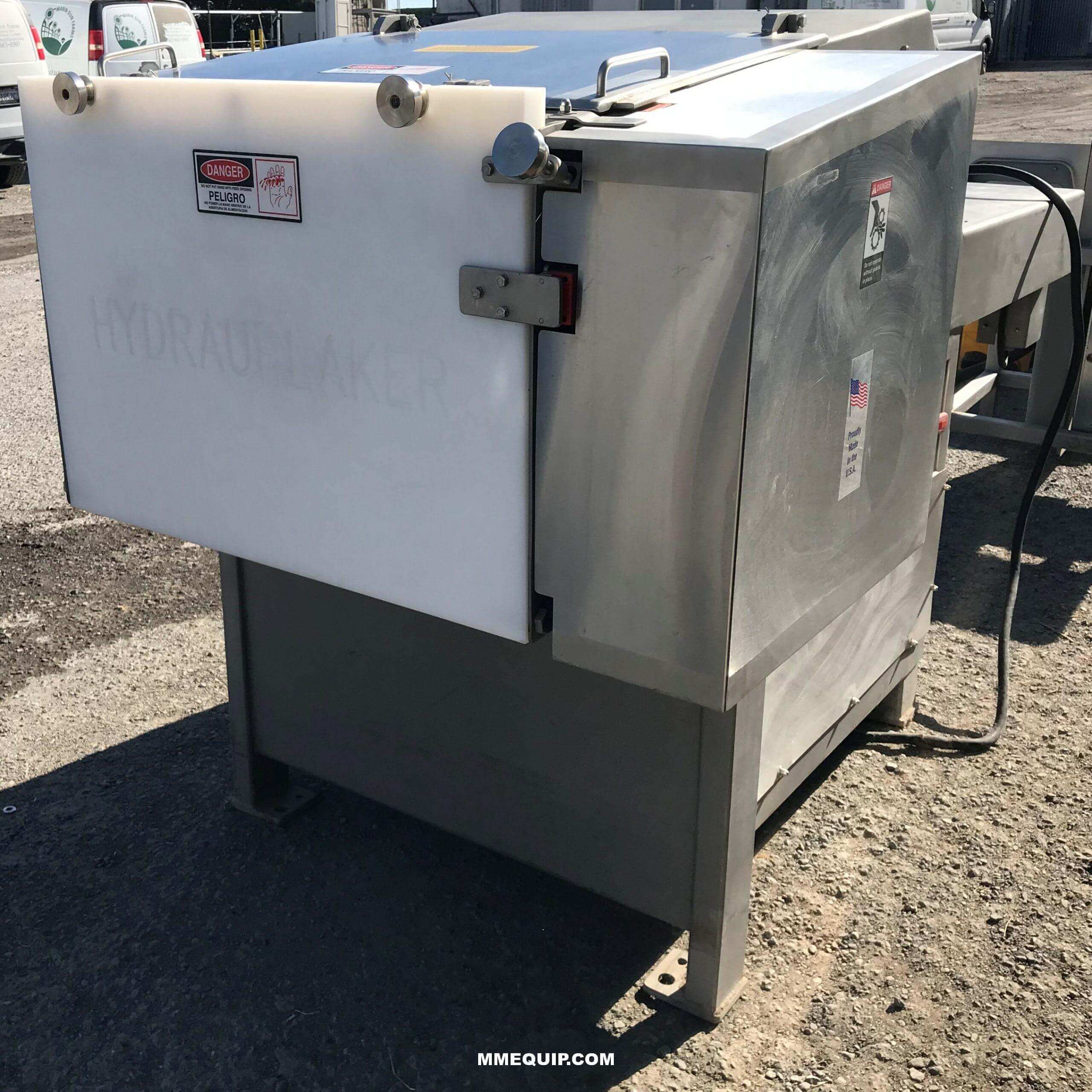 GMC 2500 Frozen Meat Flaker/Hydrauflaker. For flaking/slicing of hard or frozen blocks of meat, poultry, fish, fruit, chocolate, vegetables, etc. Best cutting temperature is 15 to 25 degrees F. but can go down to 0 degrees F. or lower, Built-in loading table with automatic air operated ram feed system. Slice blades are adjustable from 1/32″ to ¼”. Flake/Slice varies depending upon meat temperature and ram pressure and speed. Maximum block capacity is up to 10″ Thick x 24″ Wide x 24″ Long, three blocks per minute, 10 HP 208-230-460/60/3 motor and air supply of 4 CFM at 80 PSI.