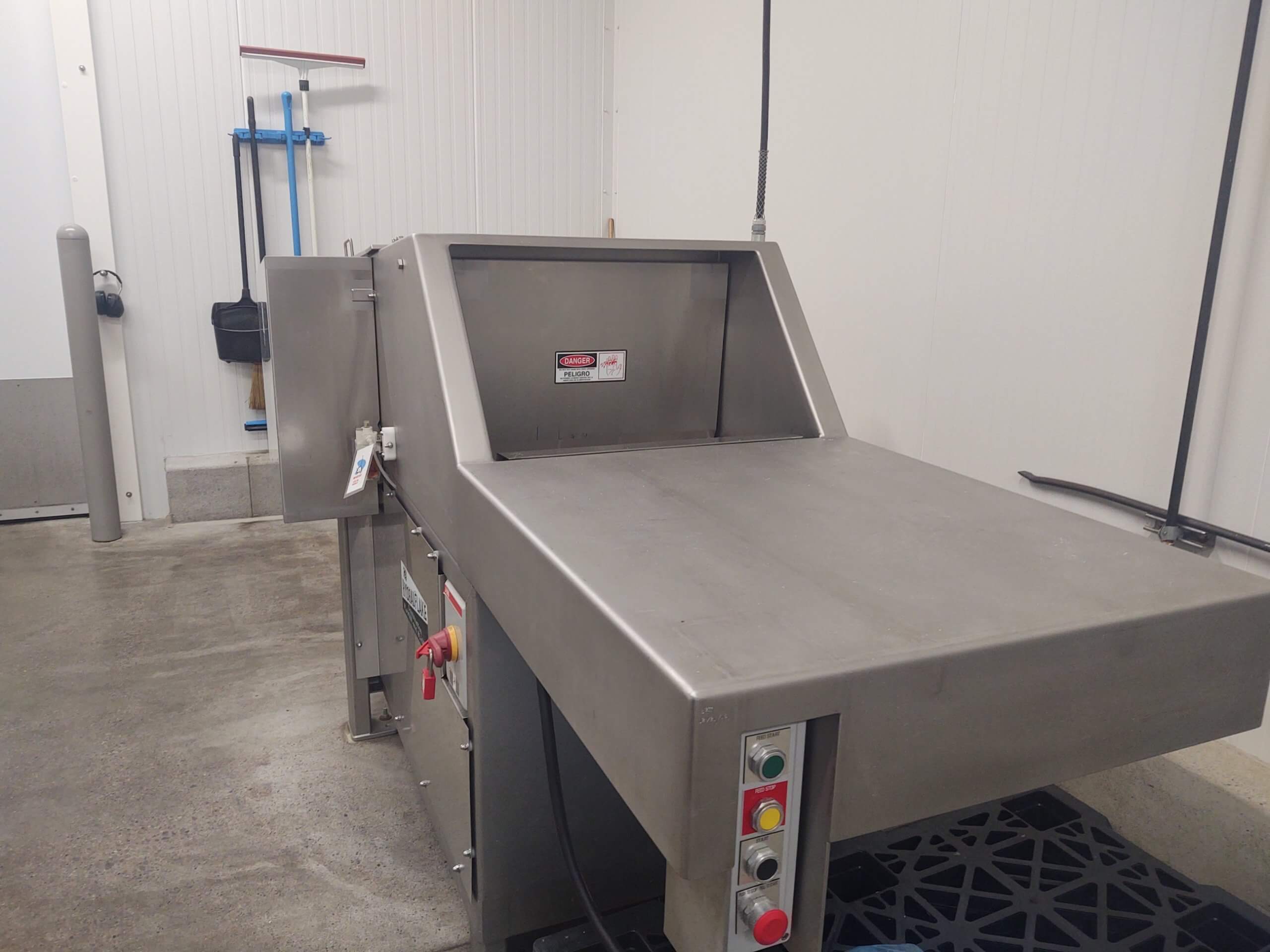 GMC 2501 Hydrauflaker. For flaking/slicing of hard or frozen blocks of meat, poultry, fish, fruit, chocolate, vegetables, etc. for further processing. Best cutting temperature is 15 to 25 degrees F. but can go down to 0 degrees F. or lower, Built-in loading table with automatic air operated ram feed system. Slice blades are adjustable from 1/32″ to ¼”. Flake/Slice varies depending upon meat temperature and ram pressure and speed. Maximum block capacity is up to 10″ Thick x 24″ Wide x 24″ Long, three blocks per minute, 10 HP 208-230-460/60/3 motor and air supply of 4 CFM at 80 PSI.