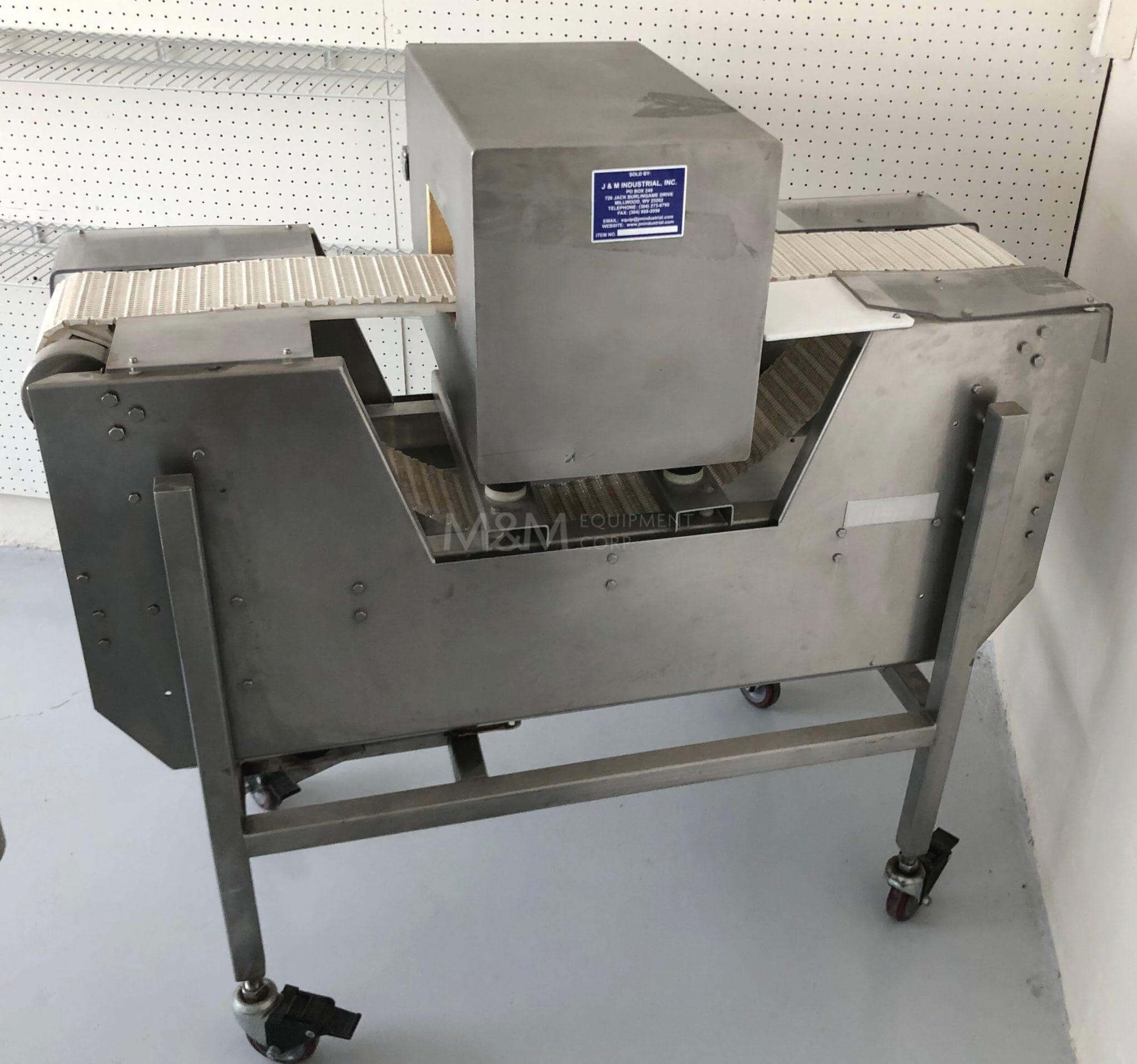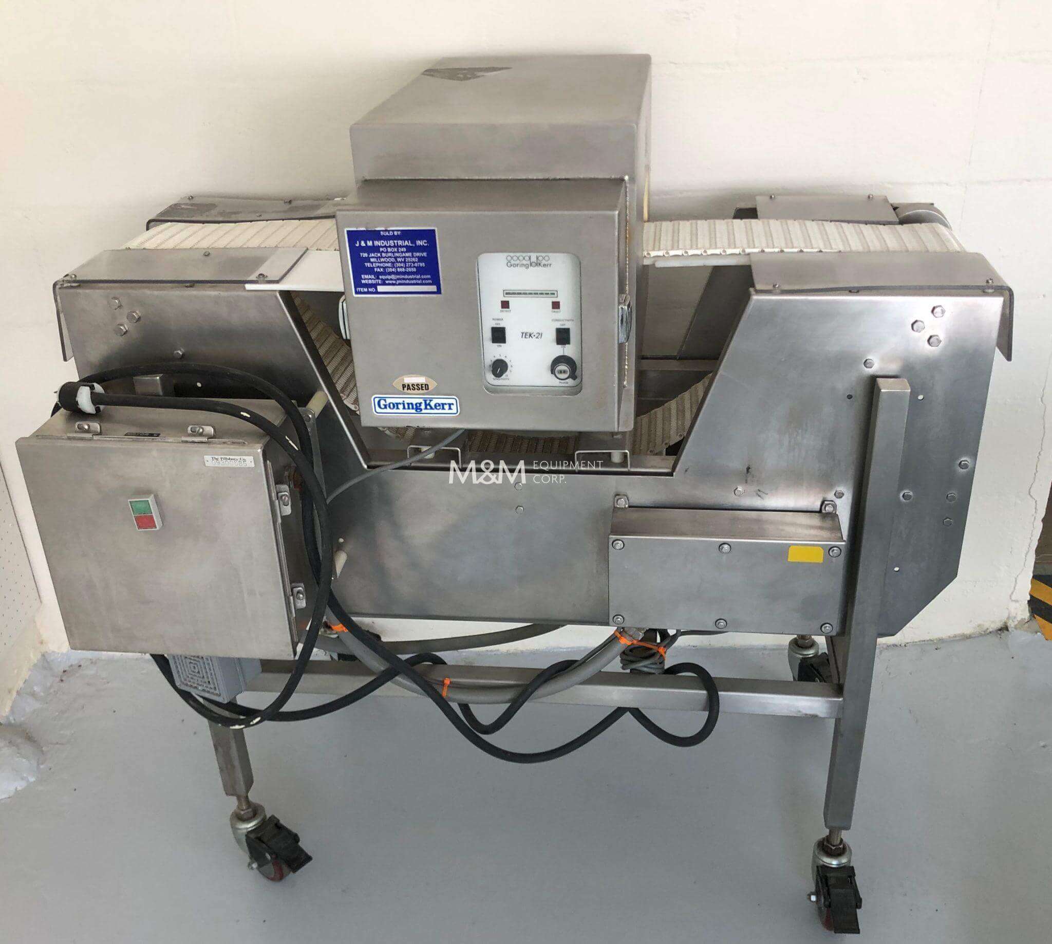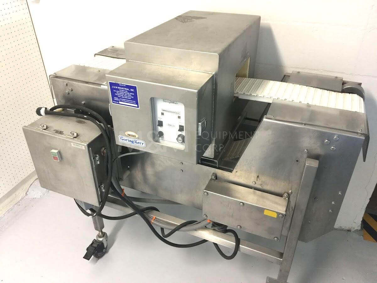 Goring Kerr Metal Detector. Mounted on a stainless steel frame with casters. 9″ wide x 4′ long plastic conveyor belt, 110V/1PH/60HZ.