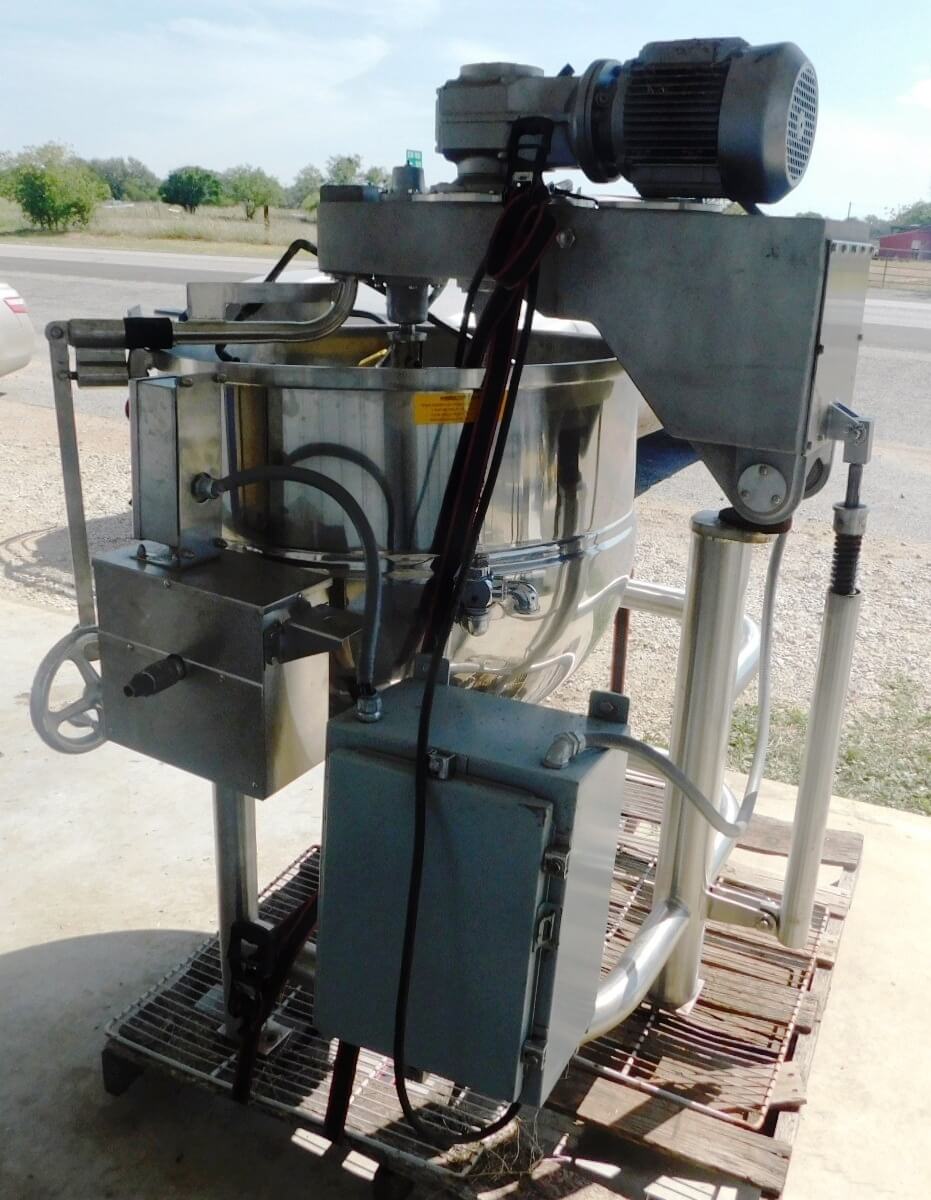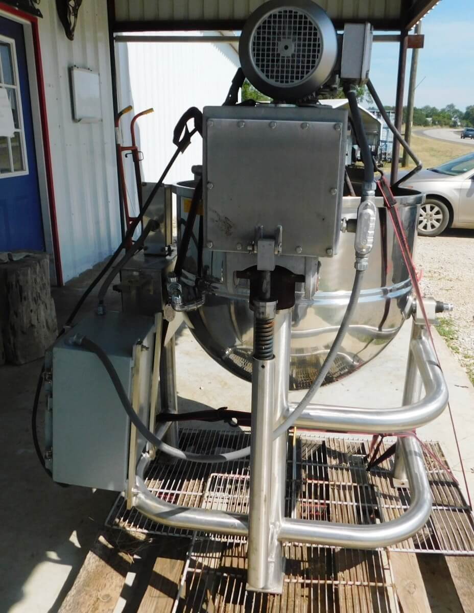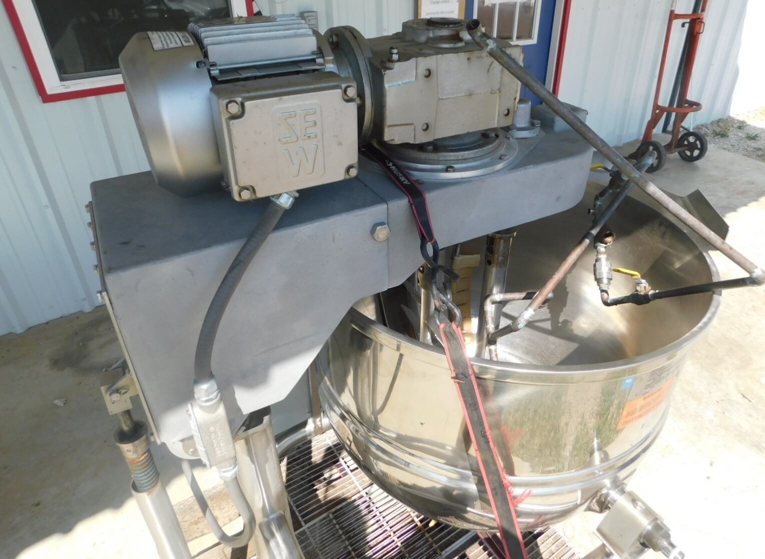 GROEN D-60 TA/3 Steam Kettle. 60 gallon capacity, double motion agitation with scrappers, Hand crank tilt discharge with pour lip and 2″ center bottom outlet. 50 PSI @ 300 F. maximum working pressure, Mounted on a stainless steel tubular frame, SEW Eurodrive motor/gearbox, with controls, 220V/3PH/60HZ.