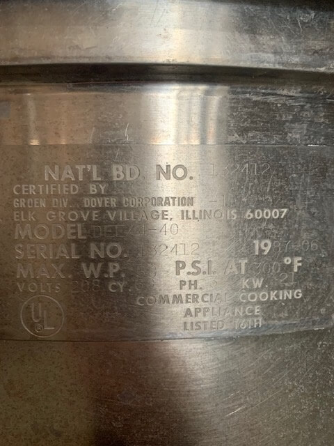 GROEN DEE / 4 – 40 Tilting Kettle. 40 gallon, floor-mounted self-contained stainless 2/3 steam jacketed kettle. The counter-balanced tilt and easy pour lip make it effortless to empty the product from the kettle. 316 stainless steel construction. Electric heated 480V/3PH/60Hz, 29 Amps. 50 psi@ 300 degrees.