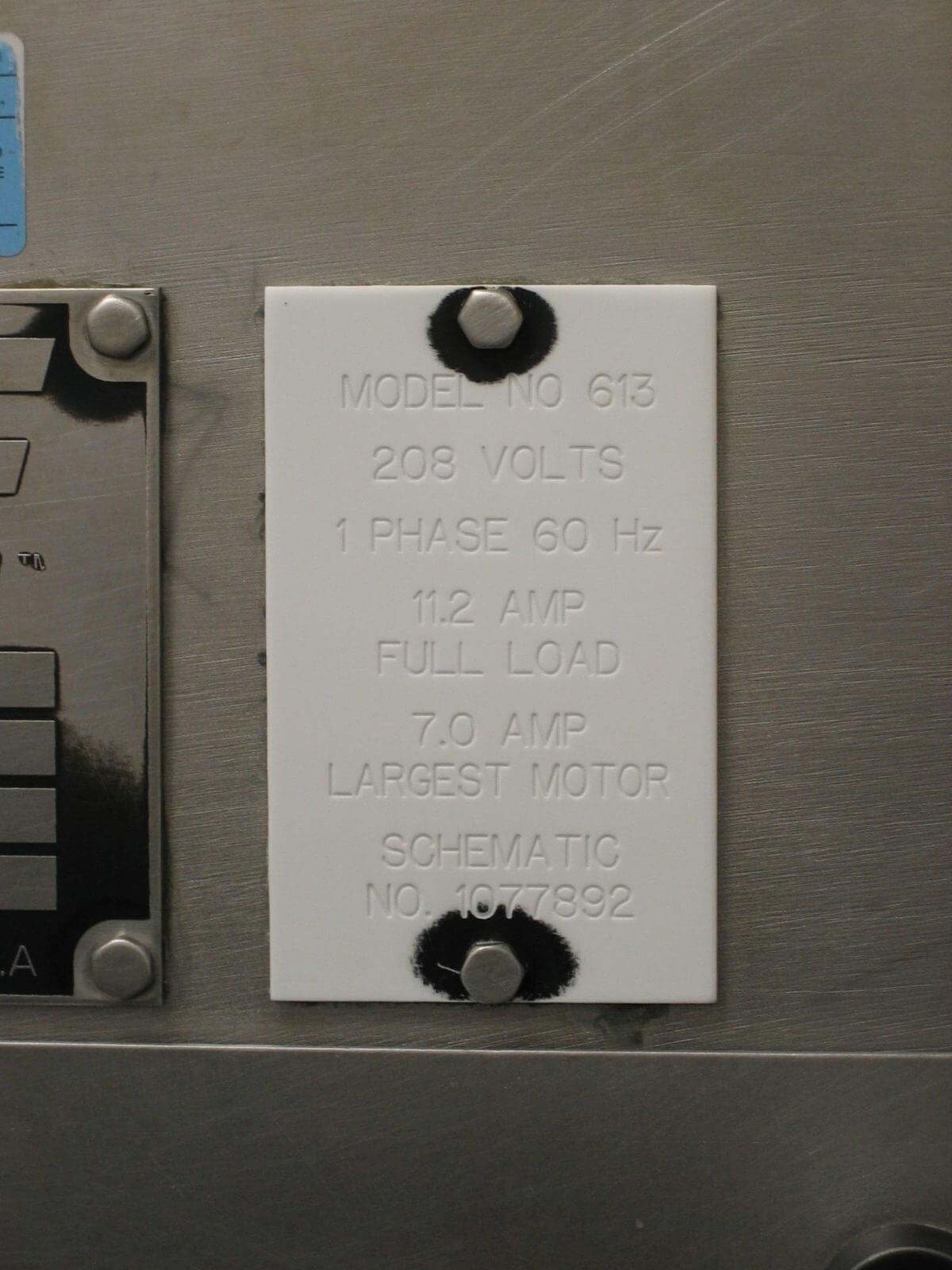 Grote Automatic Slicer. 6″ x 13″ slicing zone. 26″ tall product hopper, variable slice thickness of .02 to .5″. Slice counter, variable speed discharge conveyor. 3/4 hp drive motor. 208V/1PH/60HZ.