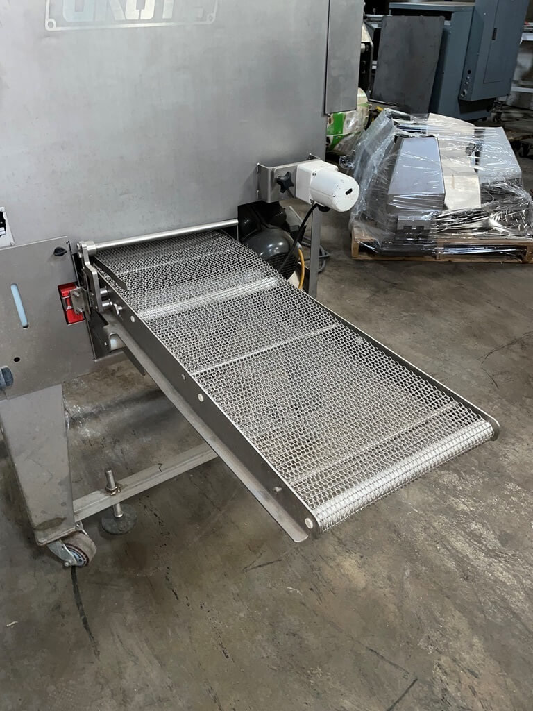 GROTE 613 VS2 Multi-Slicer. 6″ x 13″ slicing zone. 26″ tall product hopper, variable slice thickness of .04 to .5″, slice counter, variable speed discharge conveyor, operations manual, 3/4 hp drive motor. Slice, stack and shingle portions up to 90 strokes per minute, per lane. 220V/1PH/60HZ.