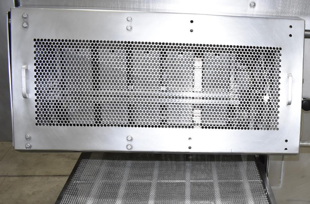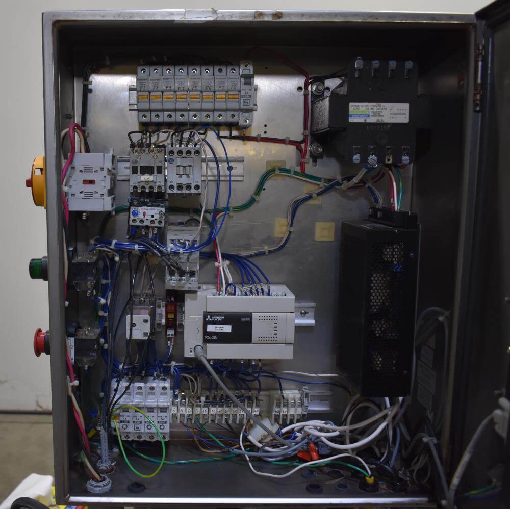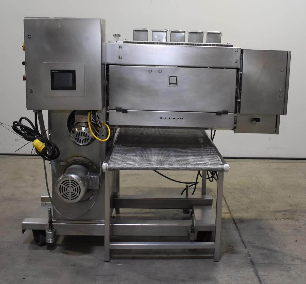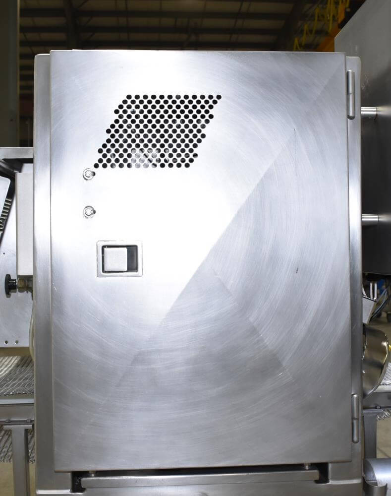 Grote S/A 530 Single Lane Applicator/Slicer. The machine is rated at up to 176 strokes per minute per lane. The unit also bulk slices, stacks and shingles. Maximum slice rate in stack or shingle mode 120 strokes per minute per lane. Set up for a 1/2″ wide band blade. Slicing zone up to 30″ wide, up to a maximum of 6″ slicing stroke. Currently set up for (5) square lanes, includes 30″ wide x 72″ long wire mesh discharge conveyor. Control panel with Mitsubishi GT1055 HMI and MELSEC-FX3u-32M PLC. Utilizes Grote’s Accuband slicing system. The machine is designed to apply toppings, top buns, pizza crusts, trays, and oven belts. Can slice and apply most boneless/non-frozen meat, fish, poultry, cheese, bread products, fruits and vegetables. Is a wash-down unit. Was last running on a fresh sandwich line. 3PH/60hz/208-230V.