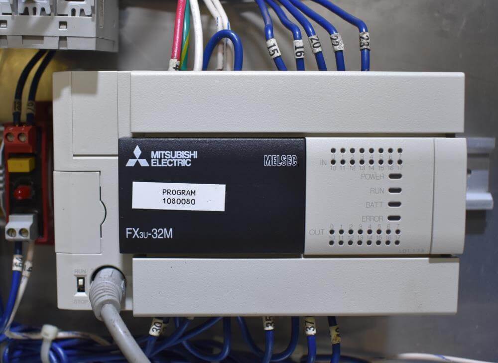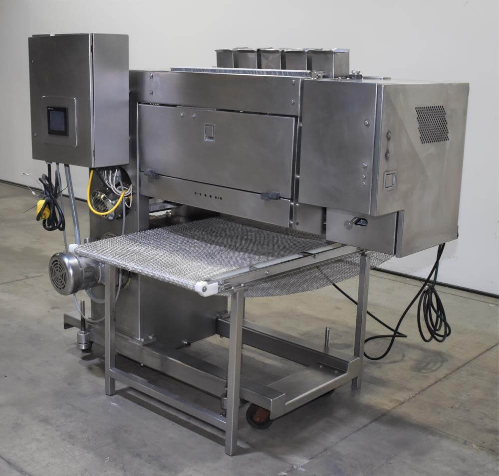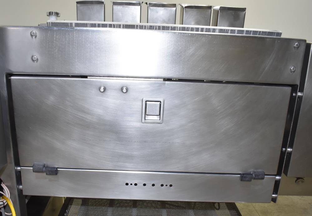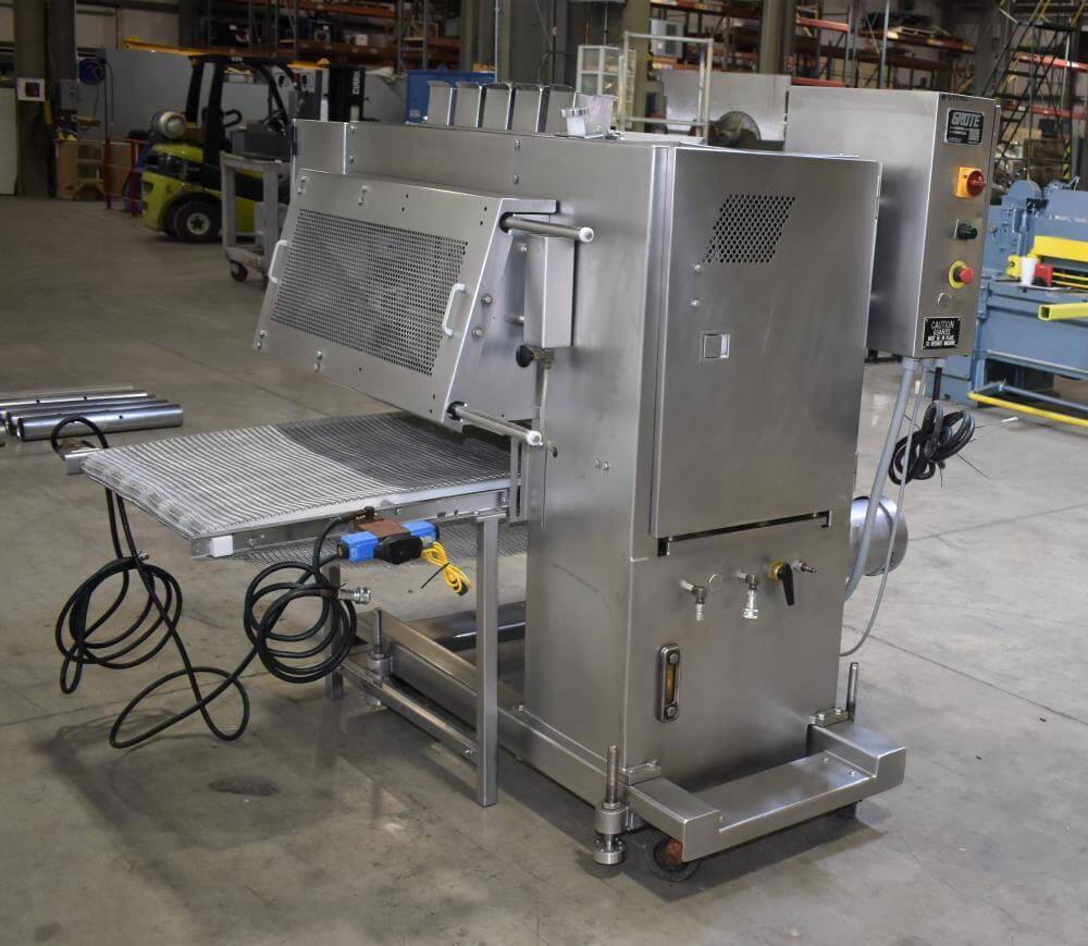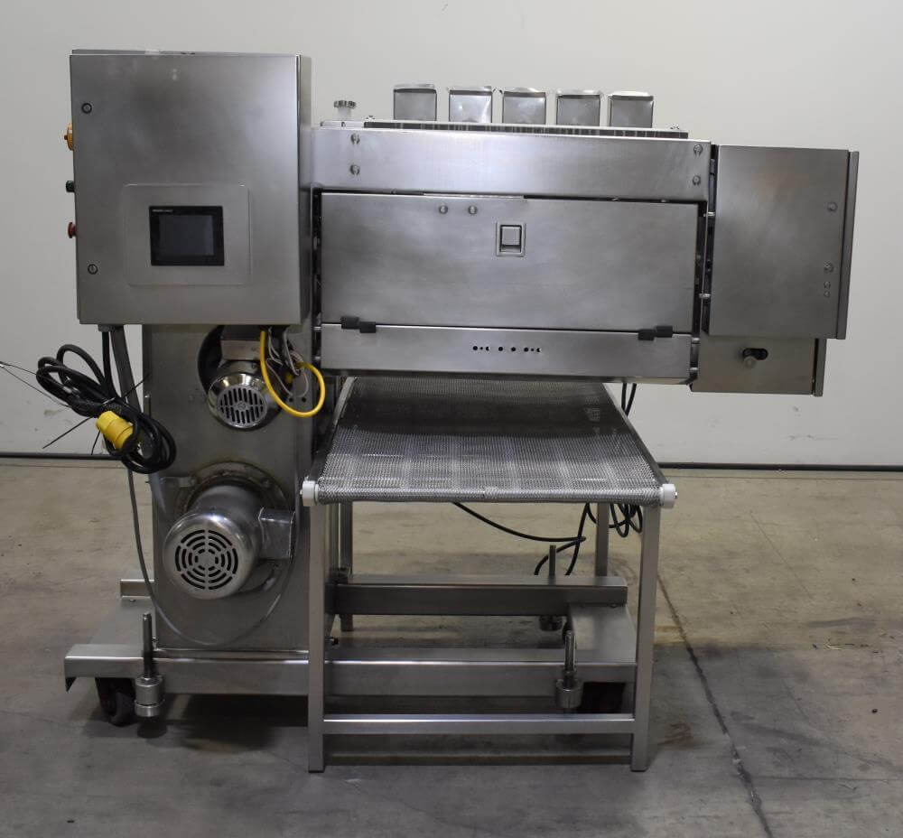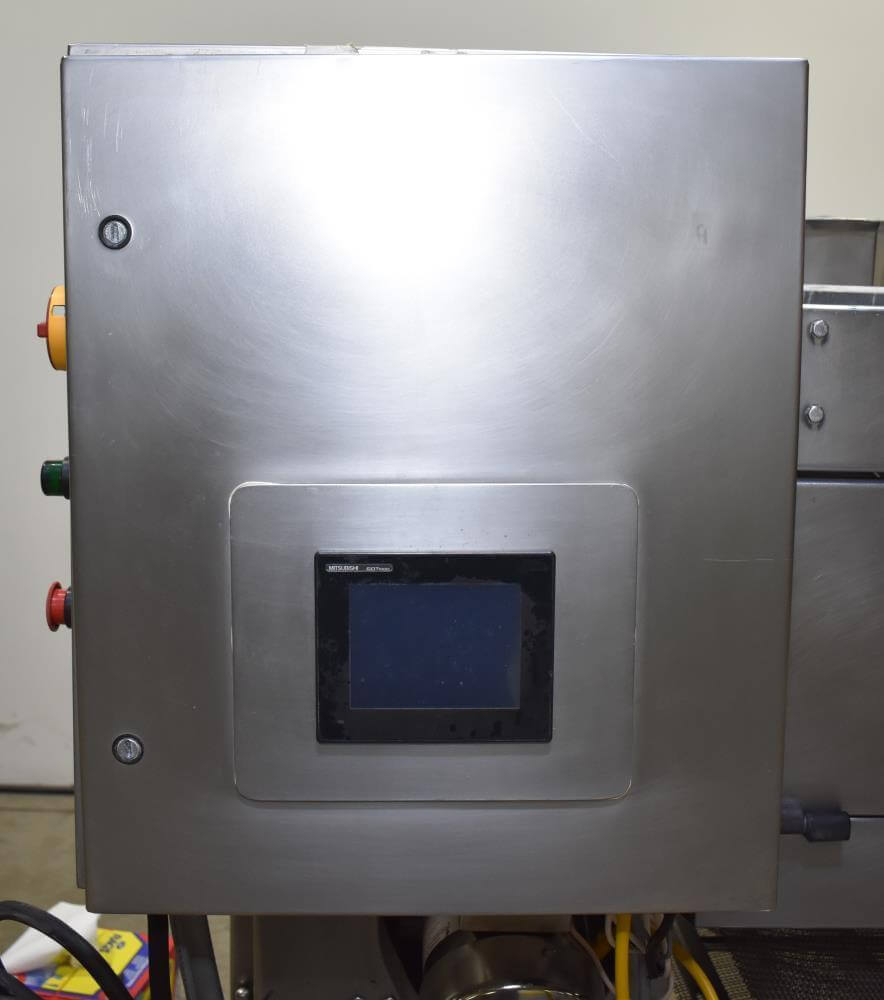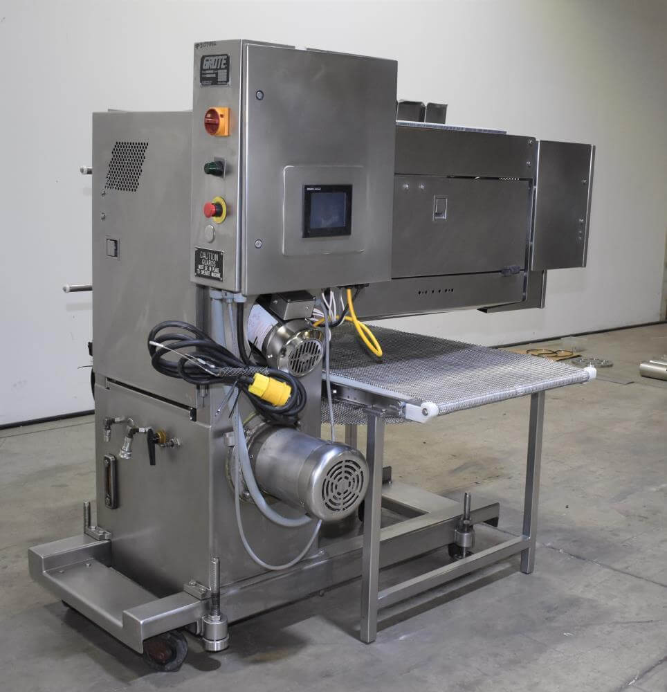 GROTE S/A 530 Single Lane Applicator/Slicer. The machine is rated at up to 176 strokes per minute per lane. The unit also bulk slices, stacks and shingles. Maximum slice rate in stack or shingle mode 120 strokes per minute per lane. Set up for a 1/2″ wide band blade. Slicing zone up to 30″ wide, up to a maximum of 6″ slicing stroke. Currently set up for (5) square lanes, includes 30″ wide x 72″ long wire mesh discharge conveyor. Control panel with Mitsubishi GT1055 HMI and MELSEC-FX3u-32M PLC. Utilizes Grote’s Accuband slicing system. The machine is designed to apply toppings, top buns, pizza crusts, trays, and oven belts. Can slice and apply most boneless/non-frozen meat, fish, poultry, cheese, bread products, fruits and vegetables. Is a wash-down unit. Was last running on a fresh sandwich line. 3PH/60hz/208-230V. Conveyor dimensions: 30 ¼” HIGH, 33” WIDE, 72” LONG.