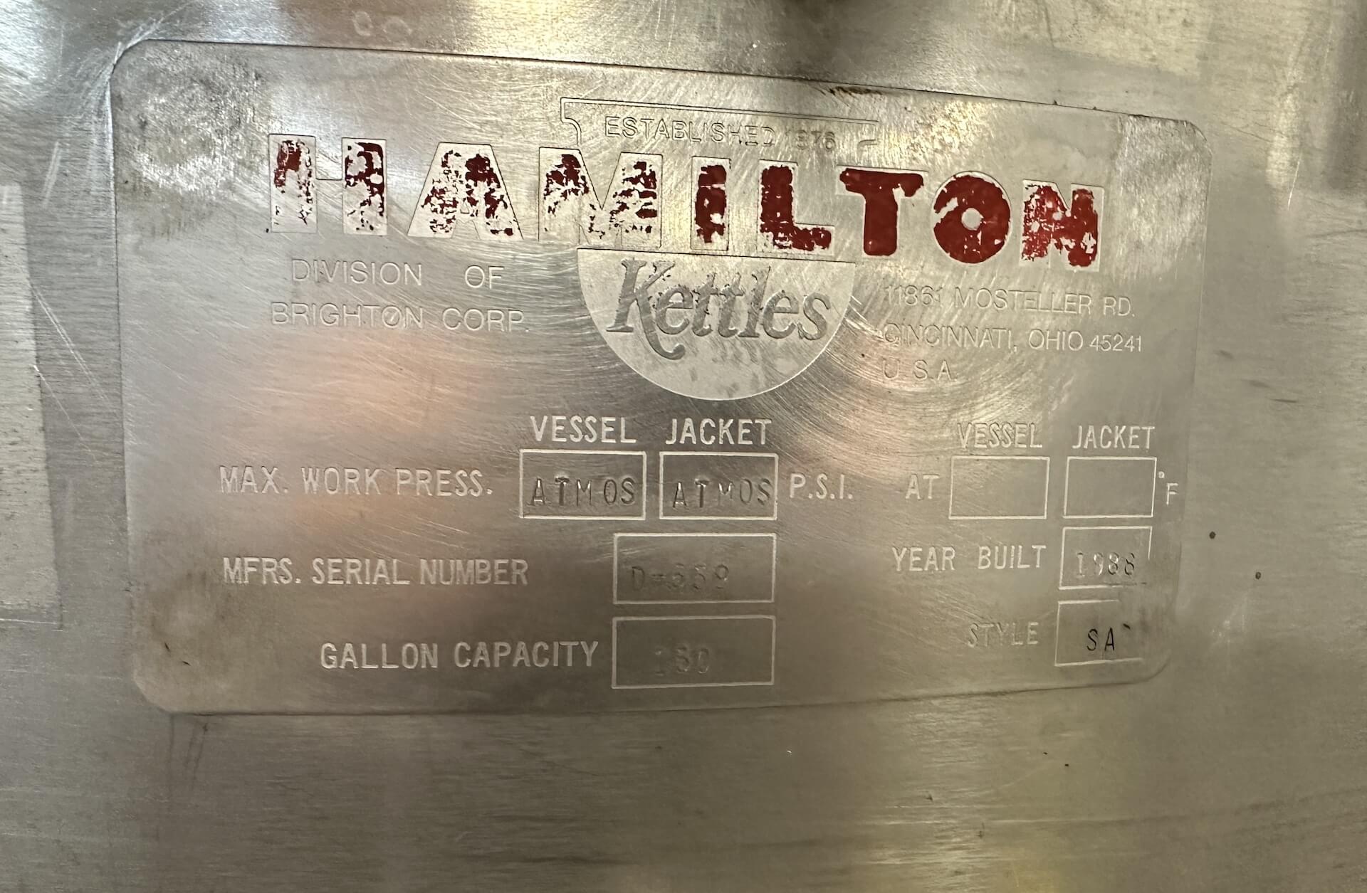 Hamilton CW Tilting Kettle. 150 Gallon, 316 Stainless Steel. Approximate 44″ d...