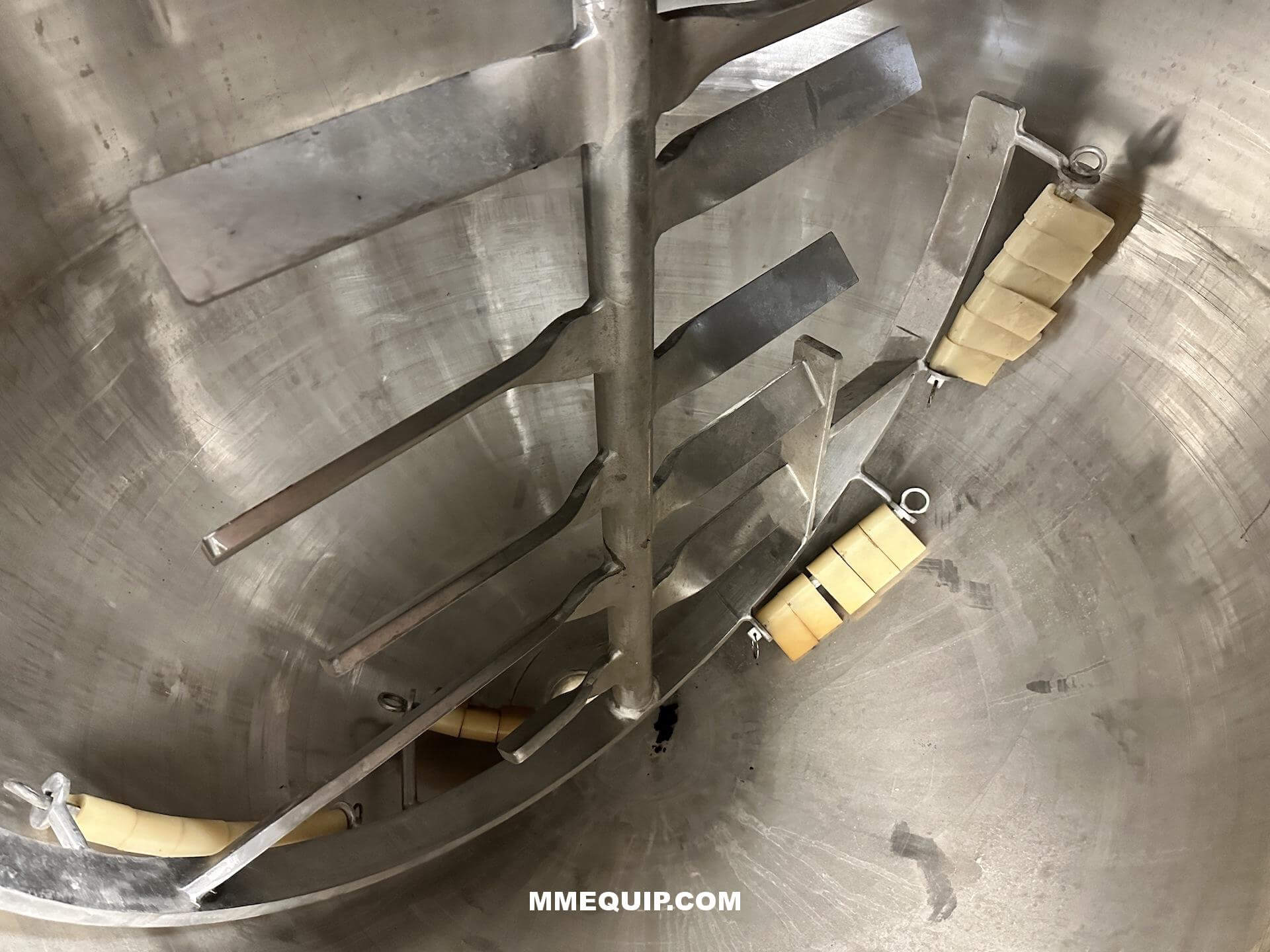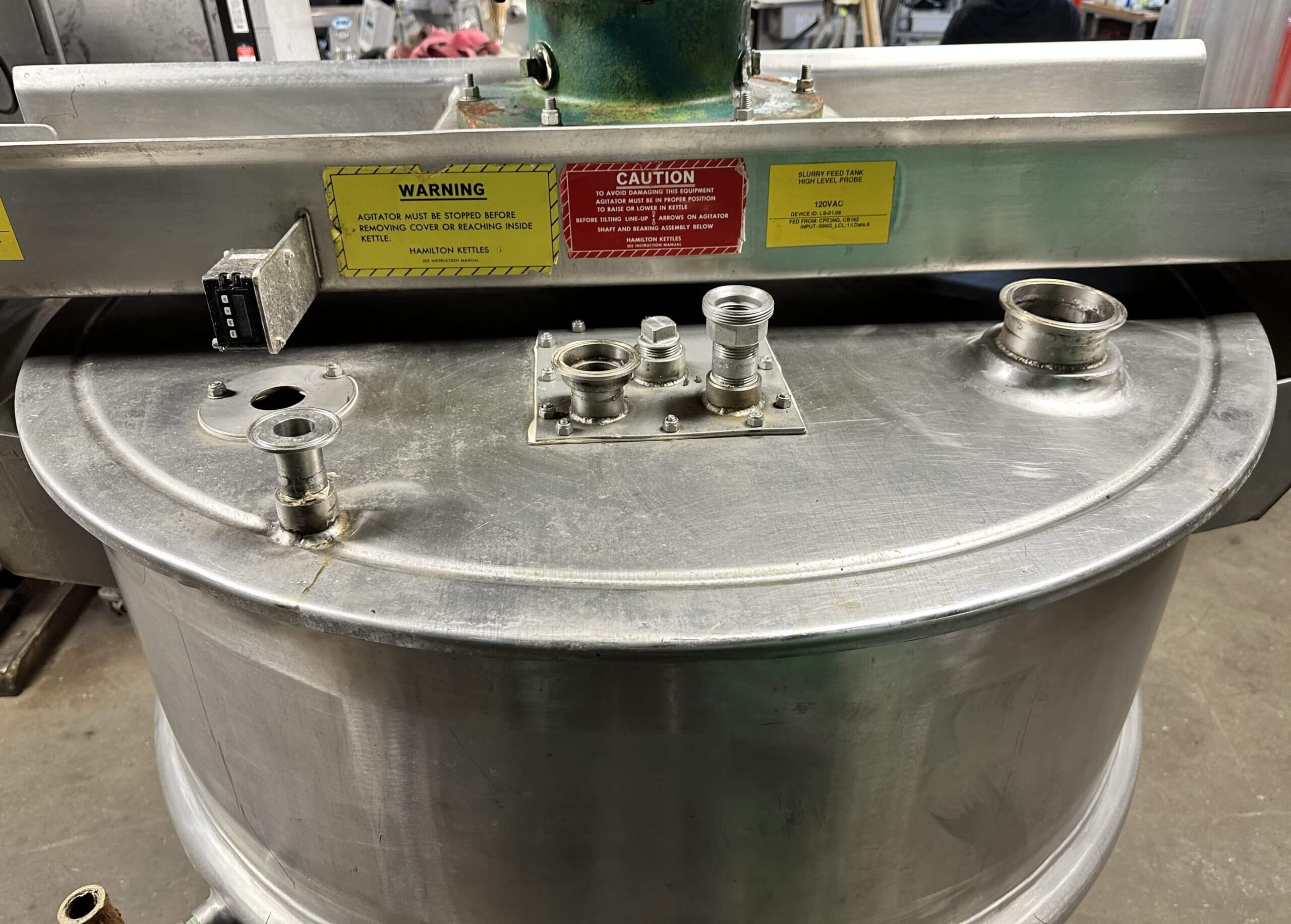 Hamilton 150 Gallon Single Motion Kettle, Stainless steel construction, Single motion agitation with scrap paddles. 1 hp drive motor with Sumitomo 20.1 gear box, 21-1/2″ center bottom outlet. Full hinged cover. Kettle is designed to operate as a holding vessel or with chilled or hot water and low pressure 15 PSI steam.