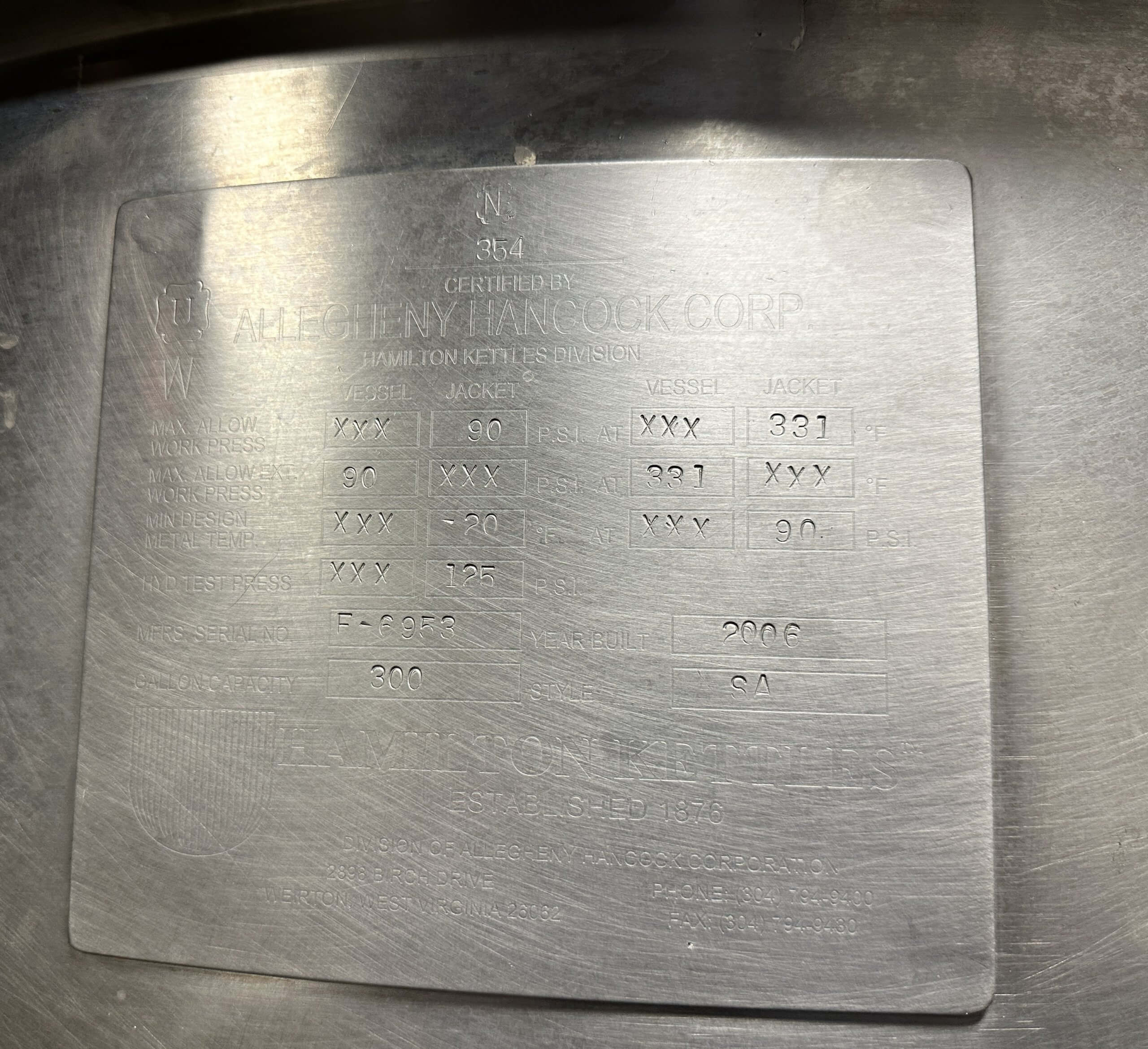 HAMILTON S/A Kettle. 300 Gallon, 90 PSI, Single action scrape surface agitation (rot...