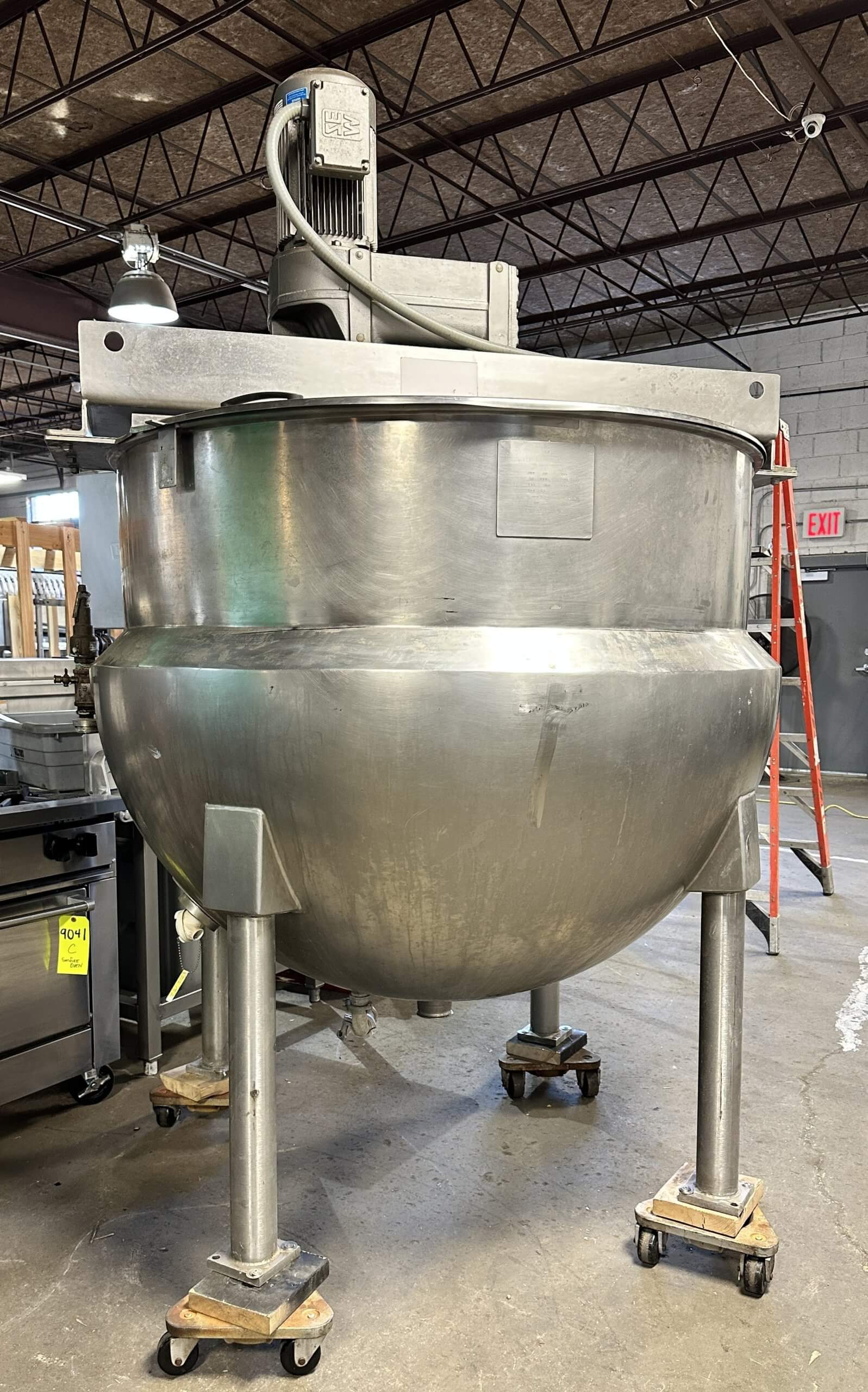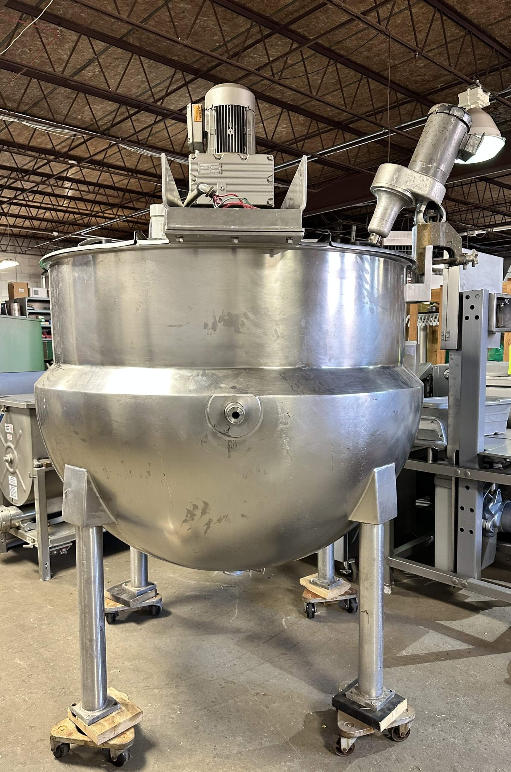HAMILTON S/A Kettle. 300 Gallon, 90 PSI, Single action scrape surface agitation (rotating sweep) with dual baffles, SEW Eurodrive 7.5 hp motor, SEW Eurodive 45.28 ratio gearbox, 38 RPM, 1720 RPM. MixMor, Mdl. C-2 incline single shaft mixer with dual propellers. 2.5″ bottom center outlet. Full set of hinged covers. 220/440V/3PH/60HZ.