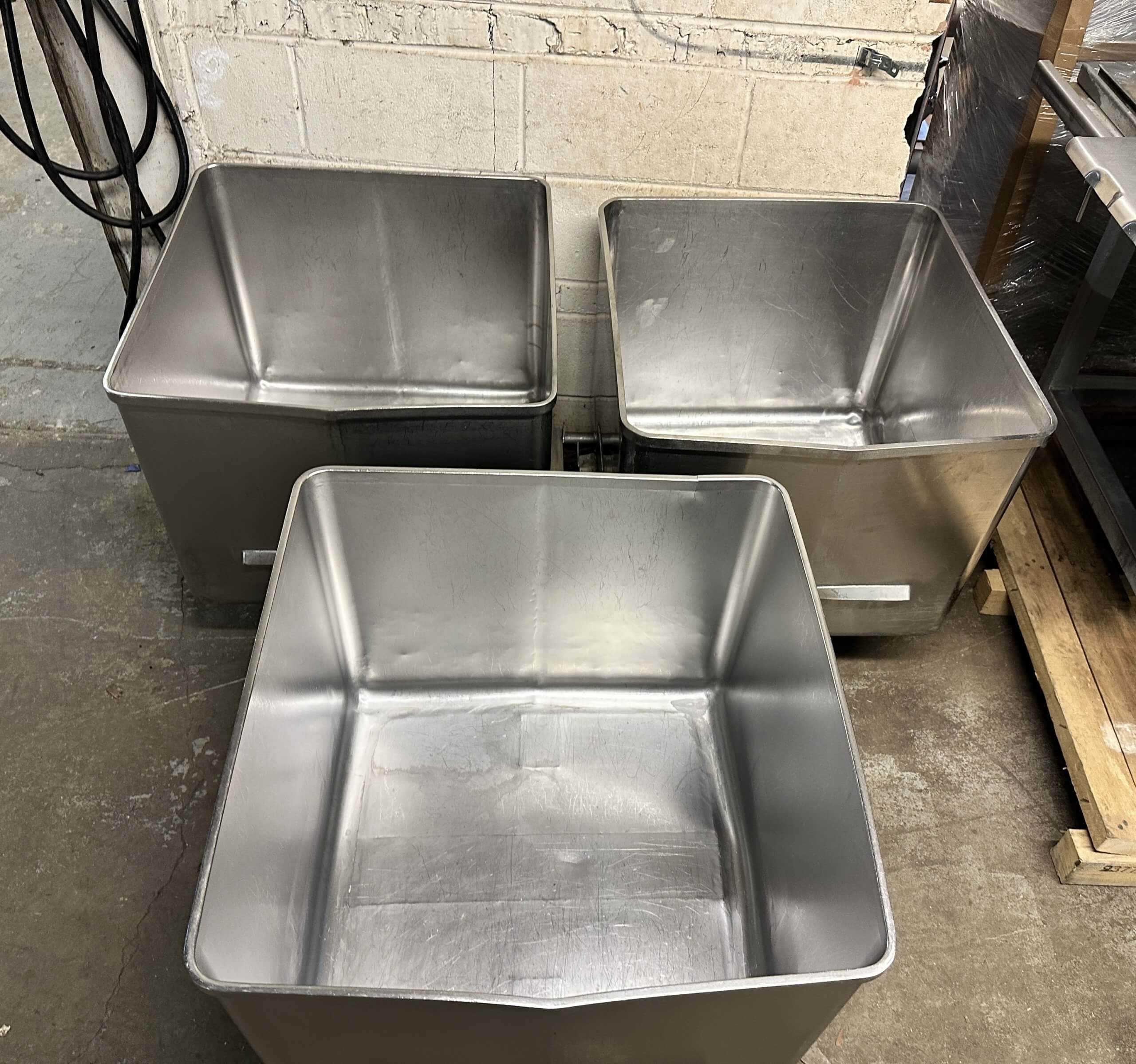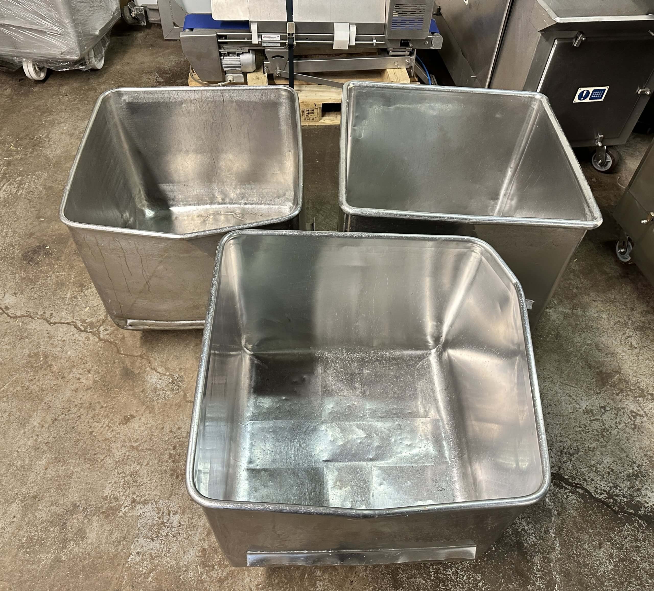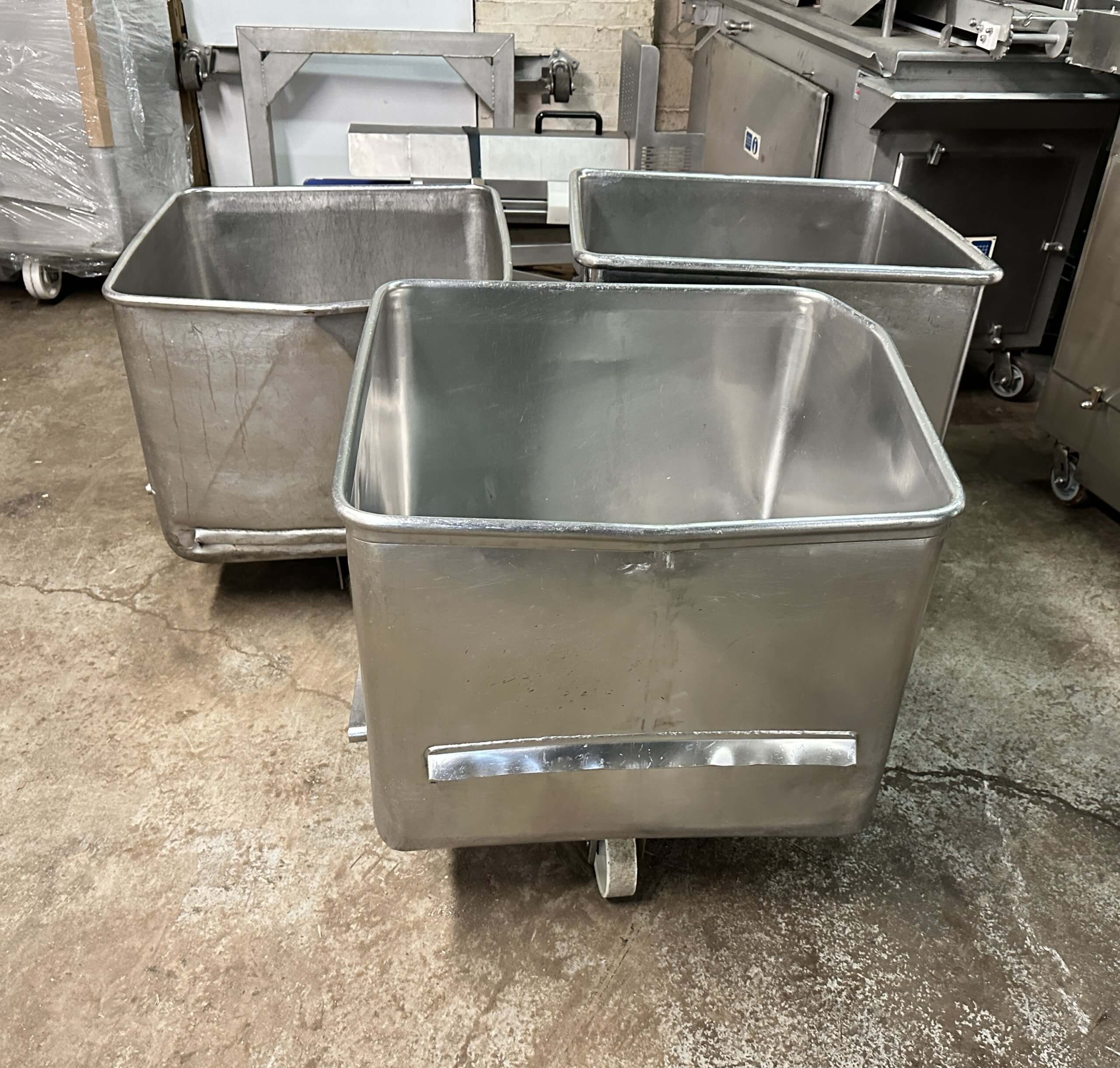(8) Good used HANTOVER 22055 Meat Truck. 400 Lbs. Dump buggies, reinforced top rim, (4) with solid bar rim and (4) with rolled lip. stainless construction, (4) 6″ X 1-1/2″ poly wheels, Dimensions: 26″ L x 26″ W x 20″ D.