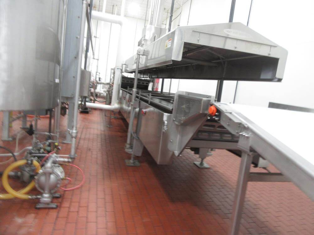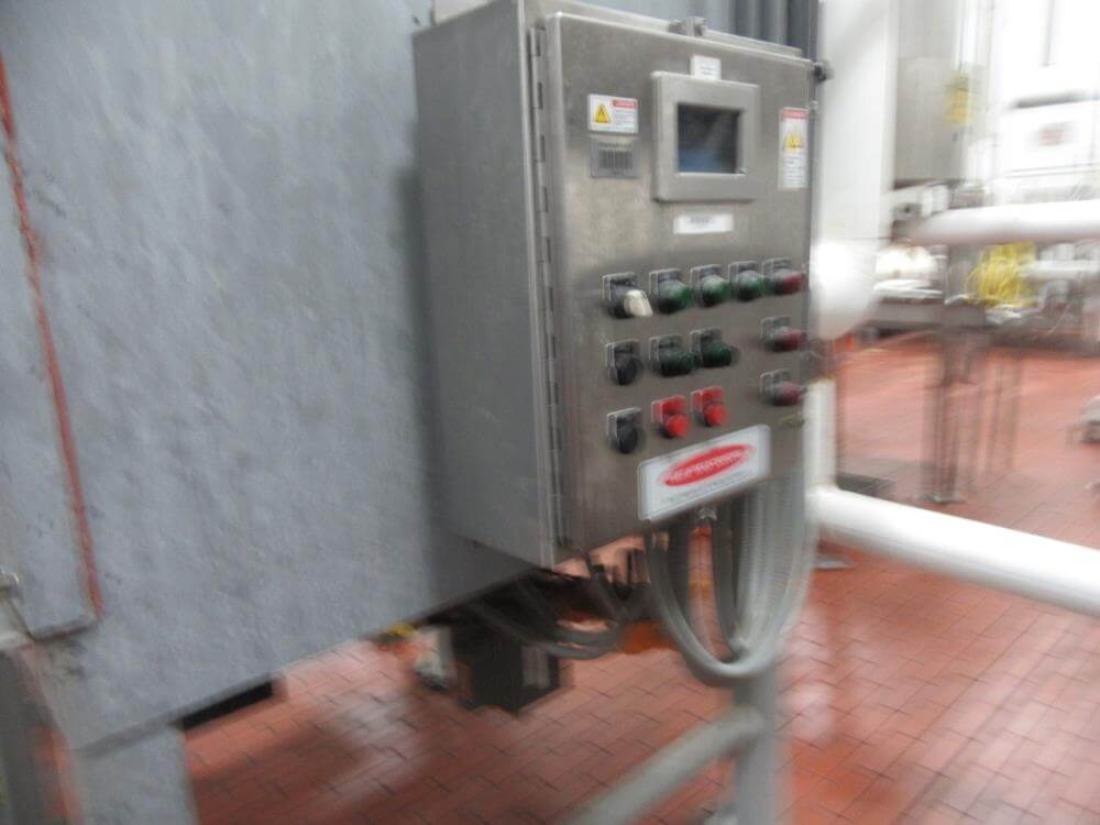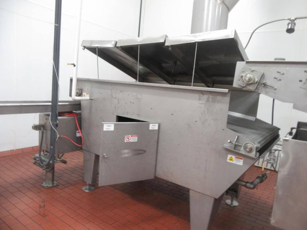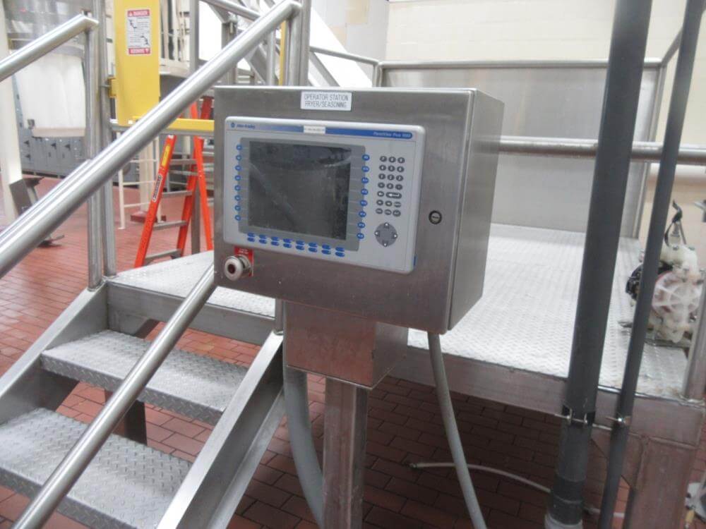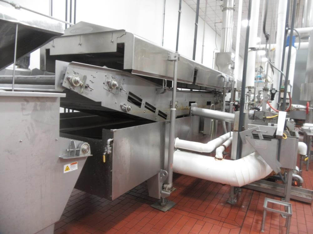 Heat and control SFF224610 Fryer. With Top Hold Down. 46 in wide x 40 ft Long, 44 in Wide Infeed Conveyor, Stainless Steel with Heat and Control Heat Exchanger, (2) – 54 in Diameter x 6 ft High Stainless Steel Jacketed Oil Tanks with Dish Bottom, 2 in Center Bottom Outlet, (3) – Stainless Steel Legs, Pioneer 30 HP Centrifugal Pump, 1 HP Stainless Steel Centrifugal Pump, Oil Separator, Heat and Control Model ME Exhaust System, Allen Bradley Remote Panelview Plus 1000 Color Touch Screen Operator Controller, Etc. Heat and Control 48 in x 8 ft Stainless Steel Ambient Air Cooler Conveyor with Stainless Steel Exhaust. 460V/3PH/60HZ