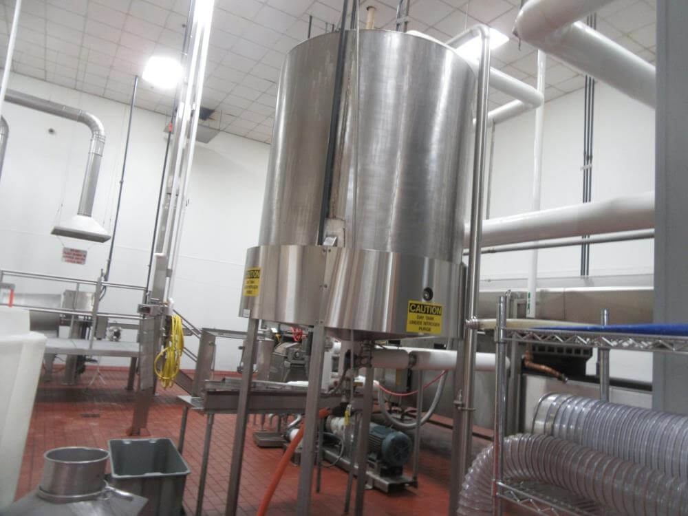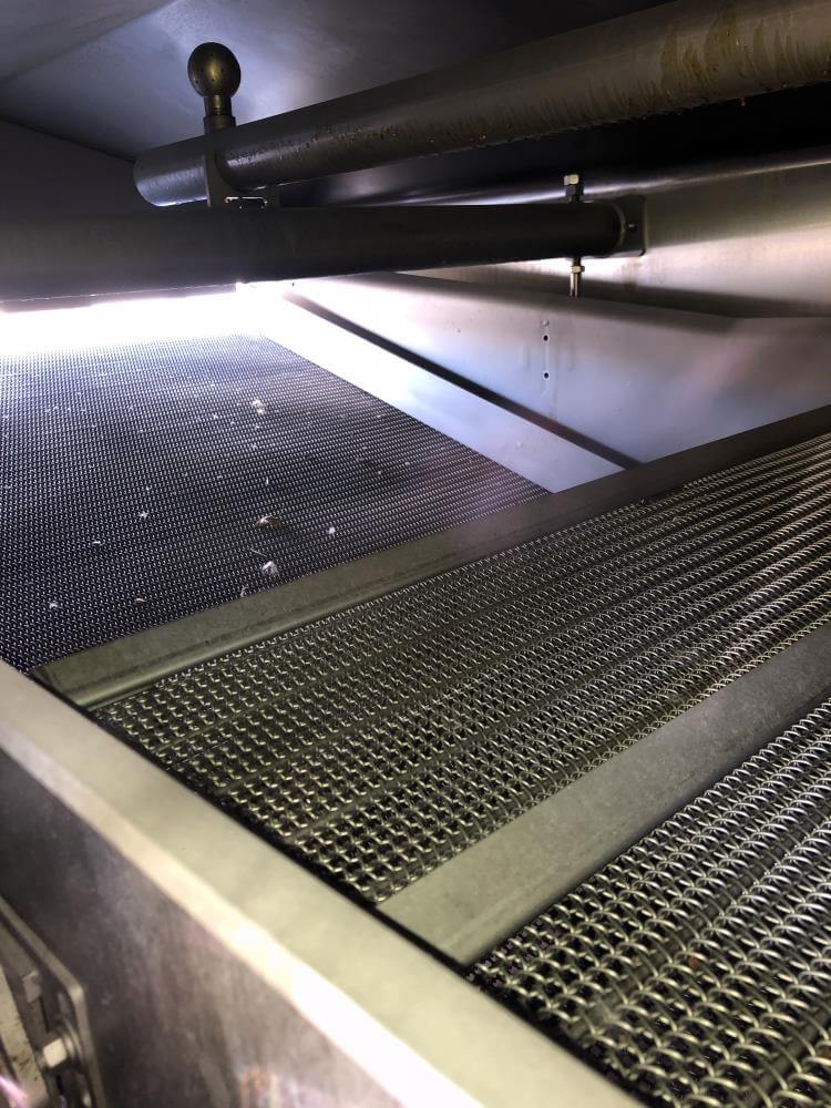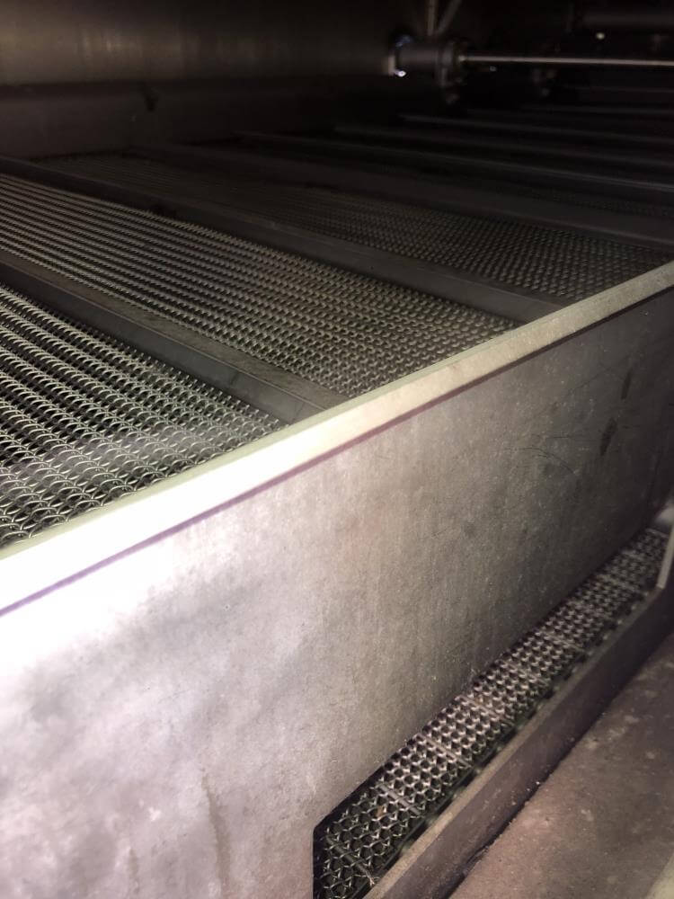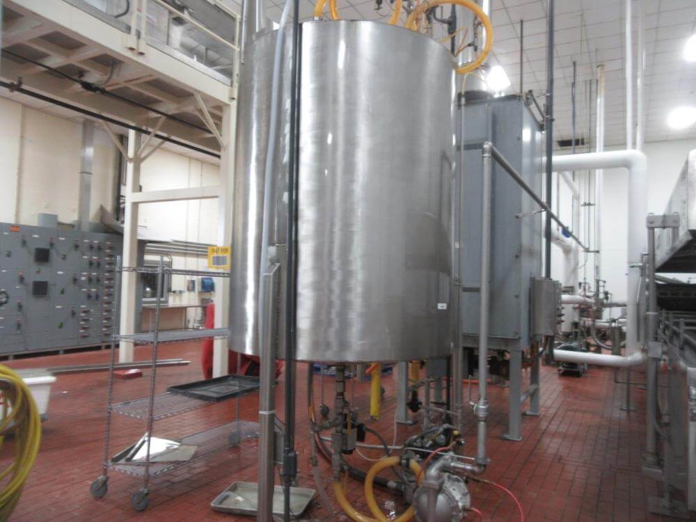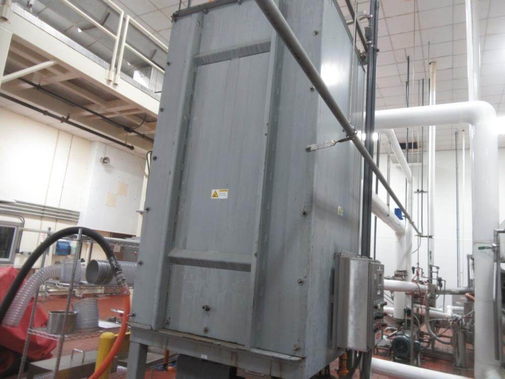 Heat and control SFF224610 Fryer. With Top Hold Down. 46 in wide x 40 ft Long, 44 in Wide Infeed Conveyor, Stainless Steel with Heat and Control Heat Exchanger, (2) – 54 in Diameter x 6 ft High Stainless Steel Jacketed Oil Tanks with Dish Bottom, 2 in Center Bottom Outlet, (3) – Stainless Steel Legs, Pioneer 30 HP Centrifugal Pump, 1 HP Stainless Steel Centrifugal Pump, Oil Separator, Heat and Control Model ME Exhaust System, Allen Bradley Remote Panelview Plus 1000 Color Touch Screen Operator Controller, Etc. Heat and Control 48 in x 8 ft Stainless Steel Ambient Air Cooler Conveyor with Stainless Steel Exhaust. 460V/3PH/60HZ