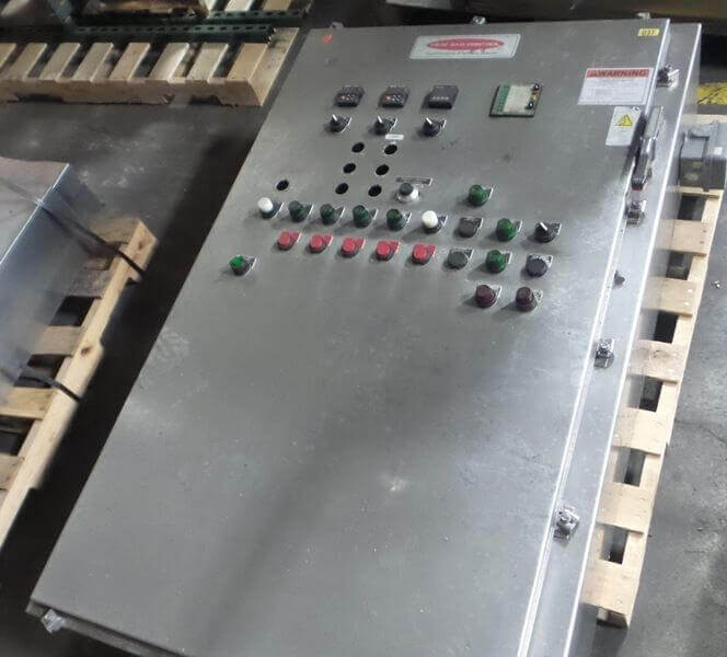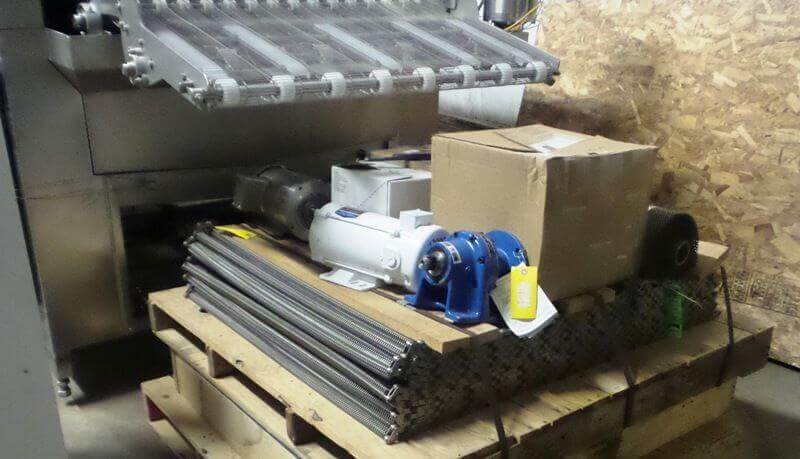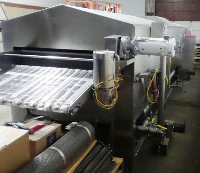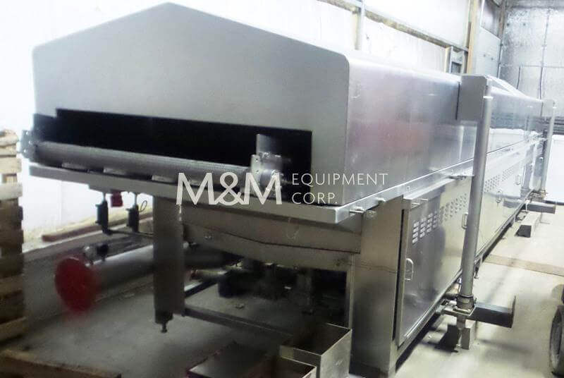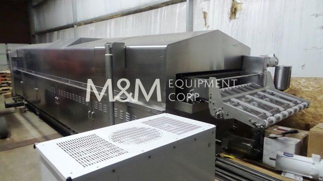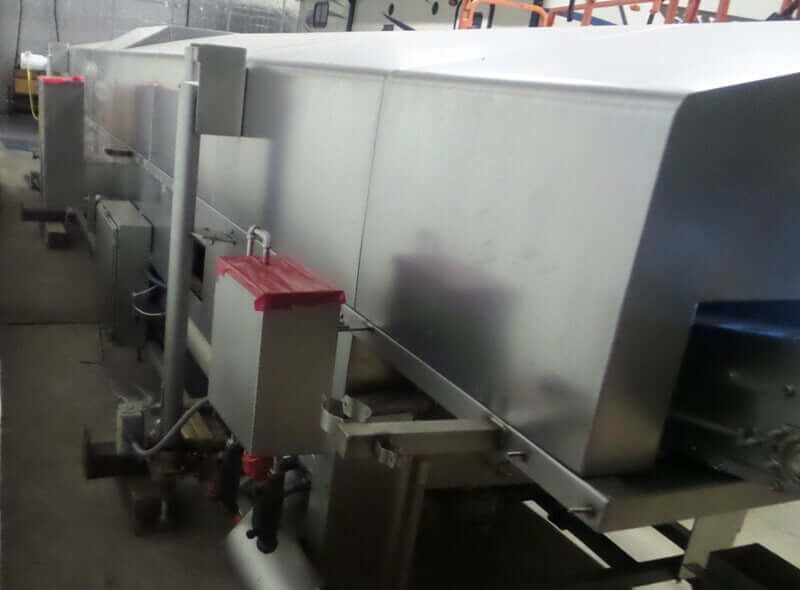 Heat & Control Hot Water Cooker, 24′ long, 18′ long cook zone, 40 ” wide stainless steel conveyor belt, top mounted product hold down conveyor, 39″ infeed & exit, 2″ NPT natural gas inlet, 1.9 million BTU per hour, wall mount control panel, 440V/3Ph/60Hz, 55 Amps, with spare conveyor belt, drive motors & gear box and exhaust duct. Used in like new condition