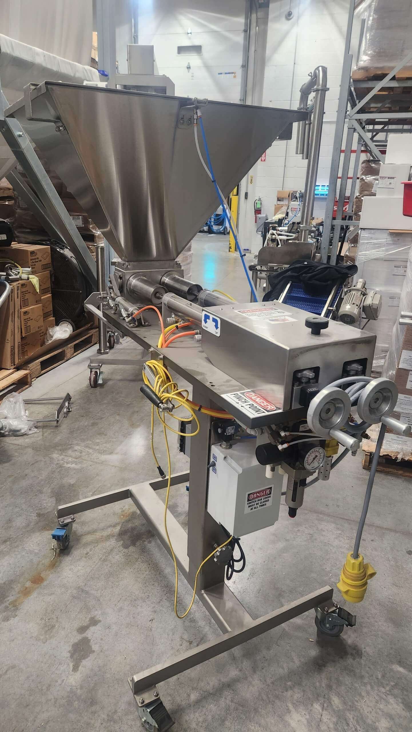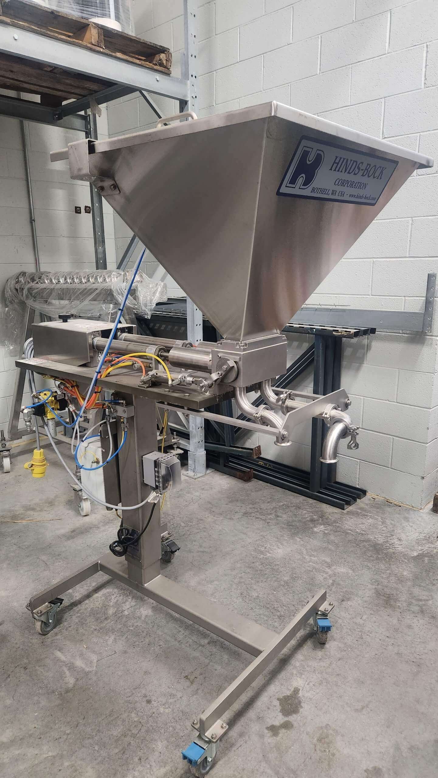 Hinds Bock dual piston Depositor. Deposit range up to 64 oz. per piston. Includes two sets of pistons and cylinders: 4 oz. – 16 oz. and 8 oz. – 32 oz. Dual port shut-off spouts, 25 gallon rectangular hopper, photo eye, variable volume & speed control. Stainless steel construction, 14″ height adjustment, mounted to a stainless steel frame on casters.