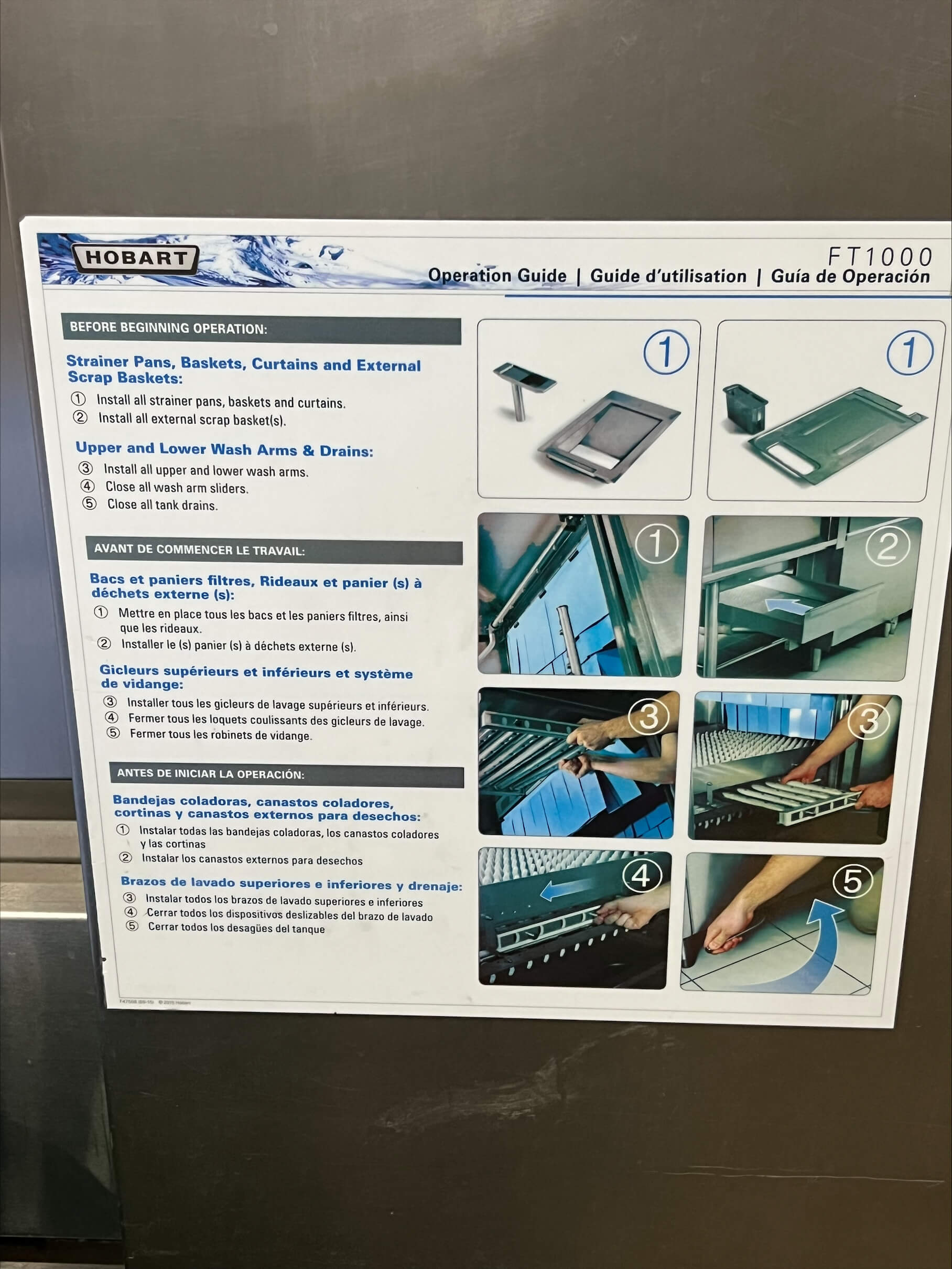 Hobart FT1000ER Energy Recovery Flight-Type Dishwasher. 58 gallons of final rinse consumption per hour, with dual rinse, hinged and insulated doors, sliding wash arms without caps, and microprocessor controls with delime notification, 240V/3PH/60HZ, 54.5 AMPS, Requires 290 Lb/Hr Steam @ 20 PSI.