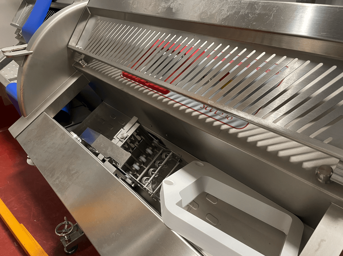 TREIF Zebra CE Slicer. Setup for 1/8″ slice thickness, minimum product temp. 2...
