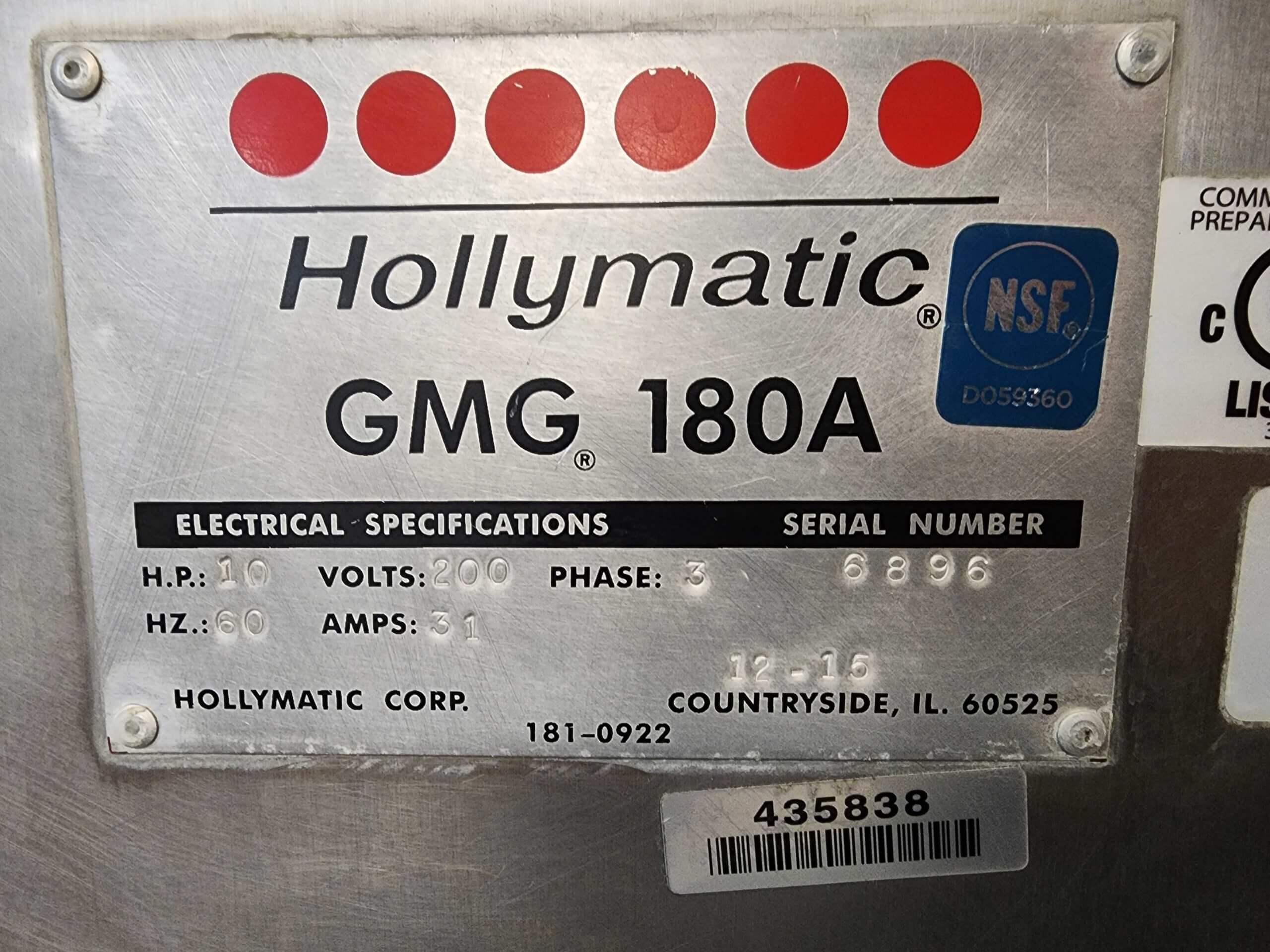 Hollymatic 180-A Mixer Grinder. Stainless steel construction. 200# capacity hopper, Gemini side port, up to 1,700 to 2,400 lbs./hour. Size 52 stainless steel barrel. 10hp motor, 200V/3PH/60HZ, 31 Amps.