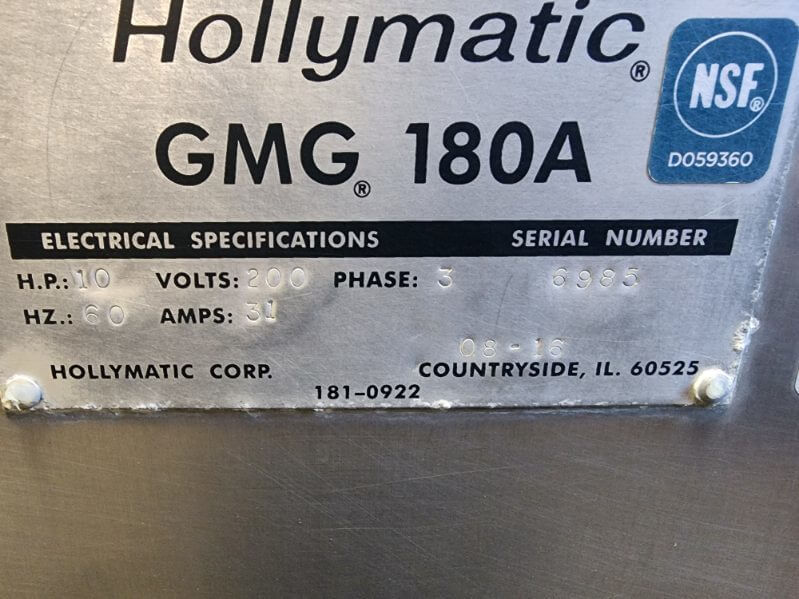 Hollymatic 180-A Mixer Grinder. Stainless steel construction. 200# capacity hopper, Grind capacity up to 1,700 to 2,400 lbs./hour. Size 52 tinned cut group. 7.5 hp motor, 230V/3PH/60HZ, 22 Amps.
