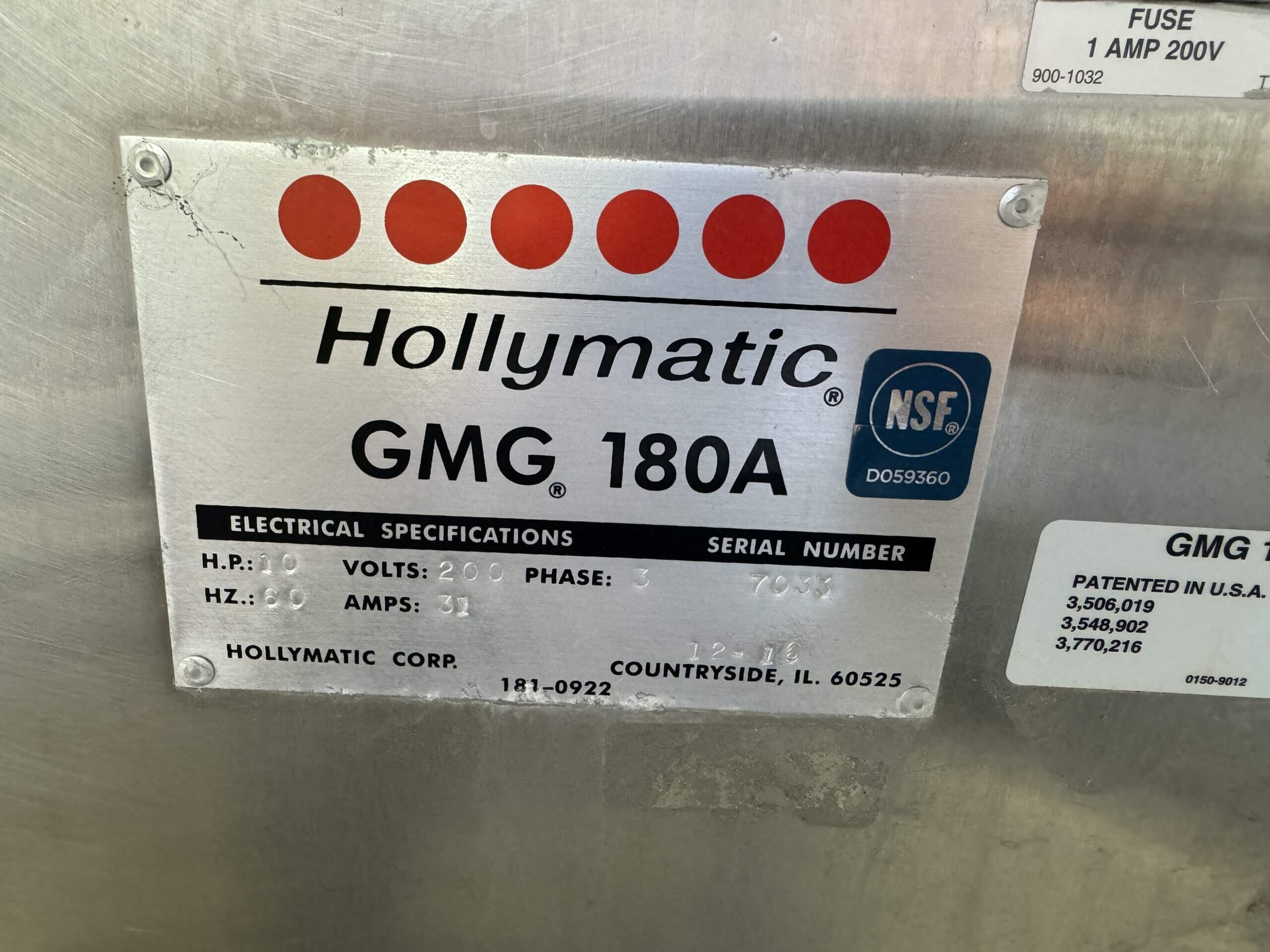 Hollymatic 180-A Mixer Grinder. Stainless steel construction. 200# capacity hopper, up to 1,700 to 2,400 lbs./hour. Side feed attachment for Gemini system. Size 52 cut group, 10hp motor, 200V/3PH/60HZ, 31 Amps.