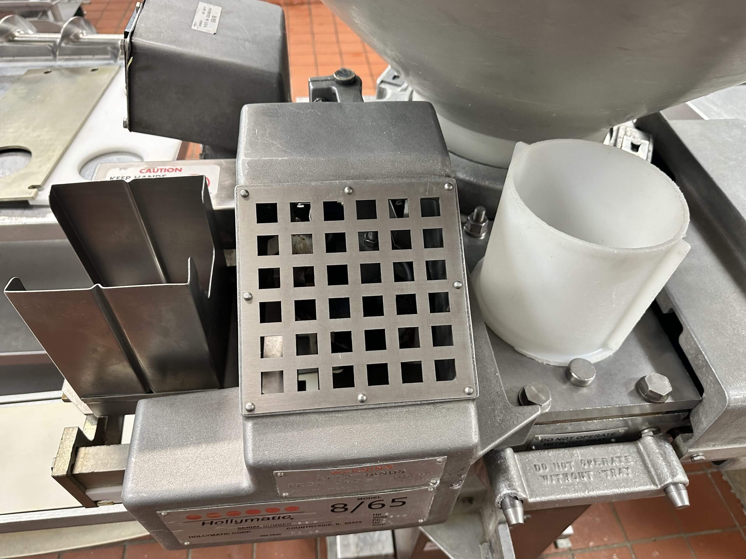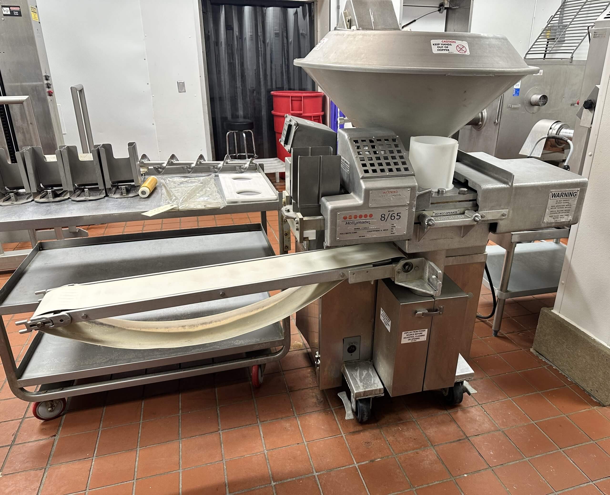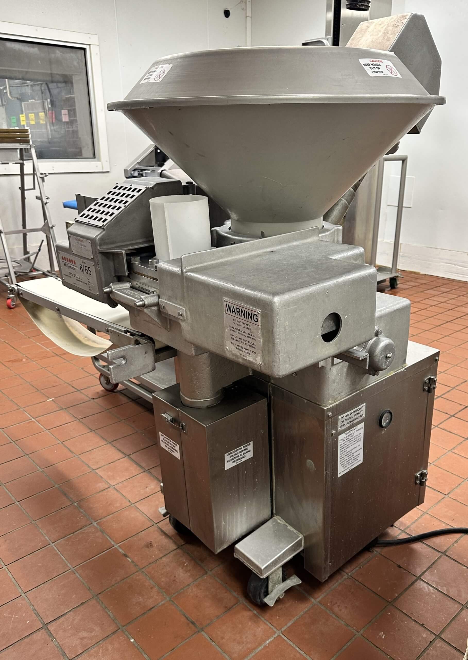 HOLLYMATIC 8/65 Patty Machine. Single hole former, produces up to 2,100 portions/hour, 60 cycles/minute, 4″ Paper feed hopper and exit conveyor. 2 hp drive motor, 200V/3PH/60HZ. 7Amp.