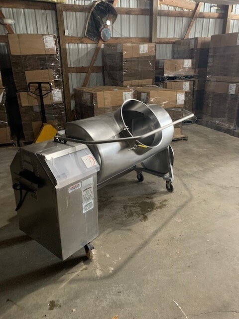 HOLLYMATIC HVTS 1000 Vacuum Tumbler. 1,000 Lbs. capacity vacuum tumbler, Vari-speed control 0-16 rpm with Forward and Reverse Capability, digital timer, Safety bar, 230V/460V/3PH//60HZ, Mounted on 4″ casters, Built-in vacuum pump, Hydraulic Drive, All stainless steel.