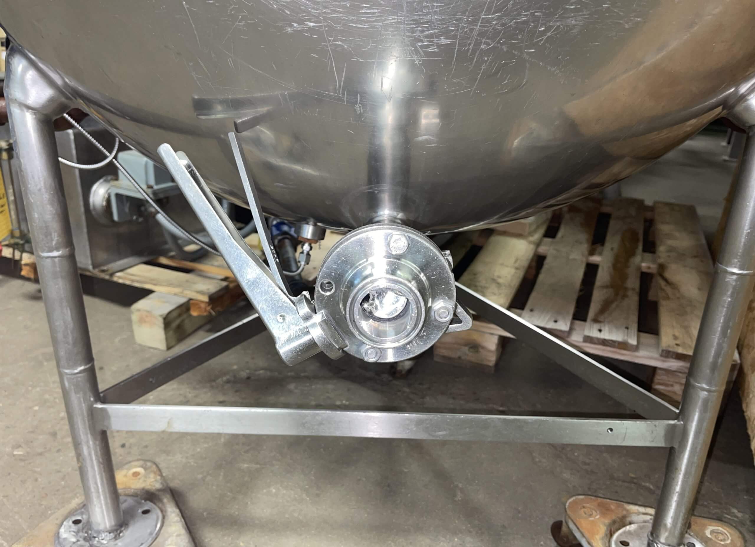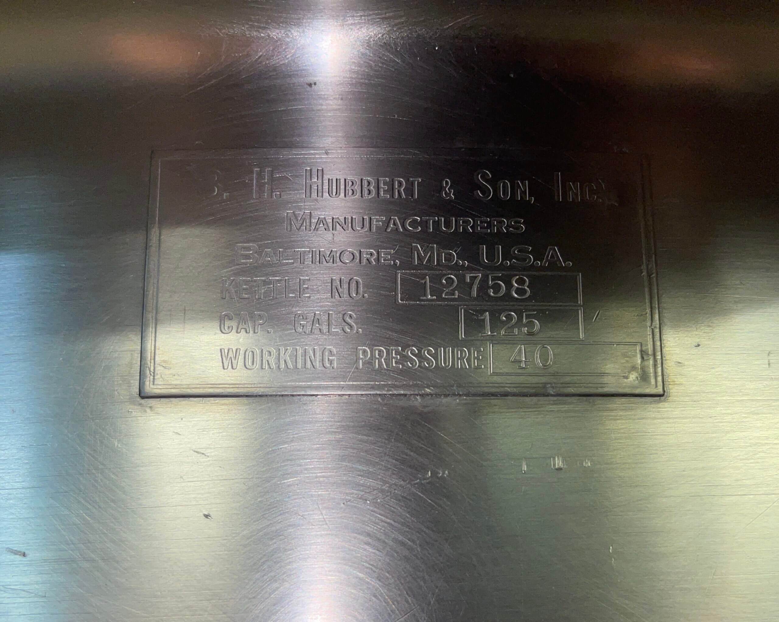 Hubbert 125 Gallon Kettle. Steam fired Kettle, 38″ x 32″ vessel with 1.5″ bottom outlet. 40 PSI, Mounted on 3 stainless steel legs, 50″ tall with full hinged cover.