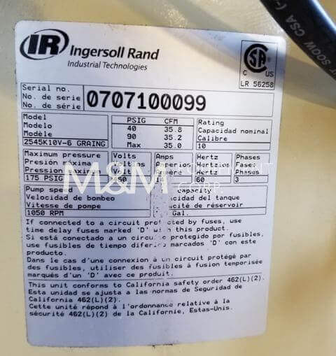 Twin Ingersoll Rand model 2545 two stage Air Compressors, 120 gallon vertical tank, Certification 833822, 1″ NPT outlet, MAWP 200 psi@ 650., 10hp motor, 1755 RPM, 230/460V/3PH/60HZ, 13.3/27 AMPS.