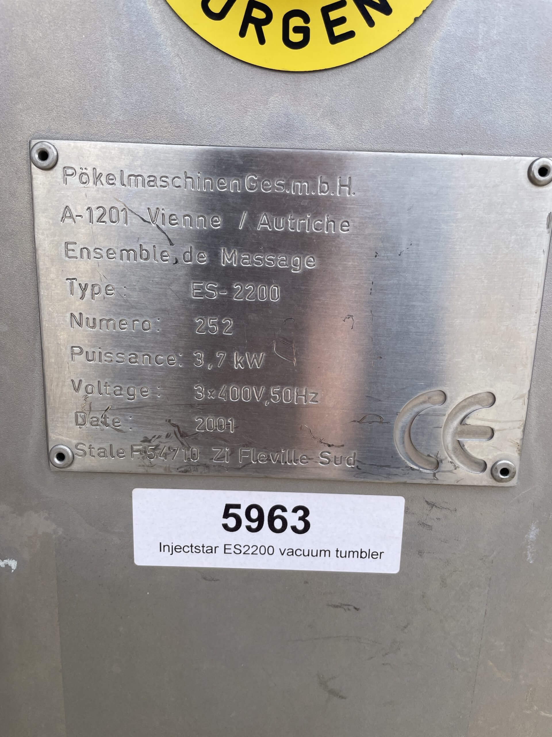INJECT STAR ES-2200 Vacuum Tumbler. 76″ H (1950 mm), 64″ W (1650 mm), 98″ L (2500 mm), 2200 Liter capacity, 400V/3PH/50Hz, Total power: 3.7 kW.