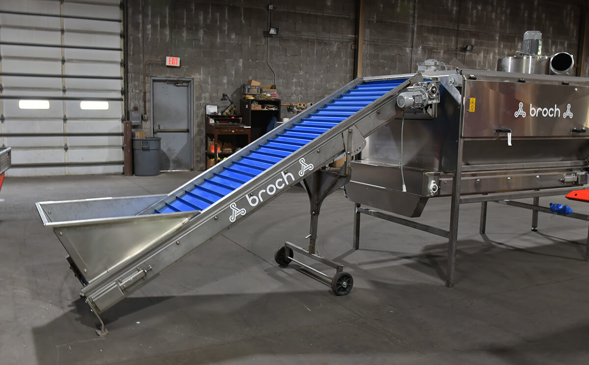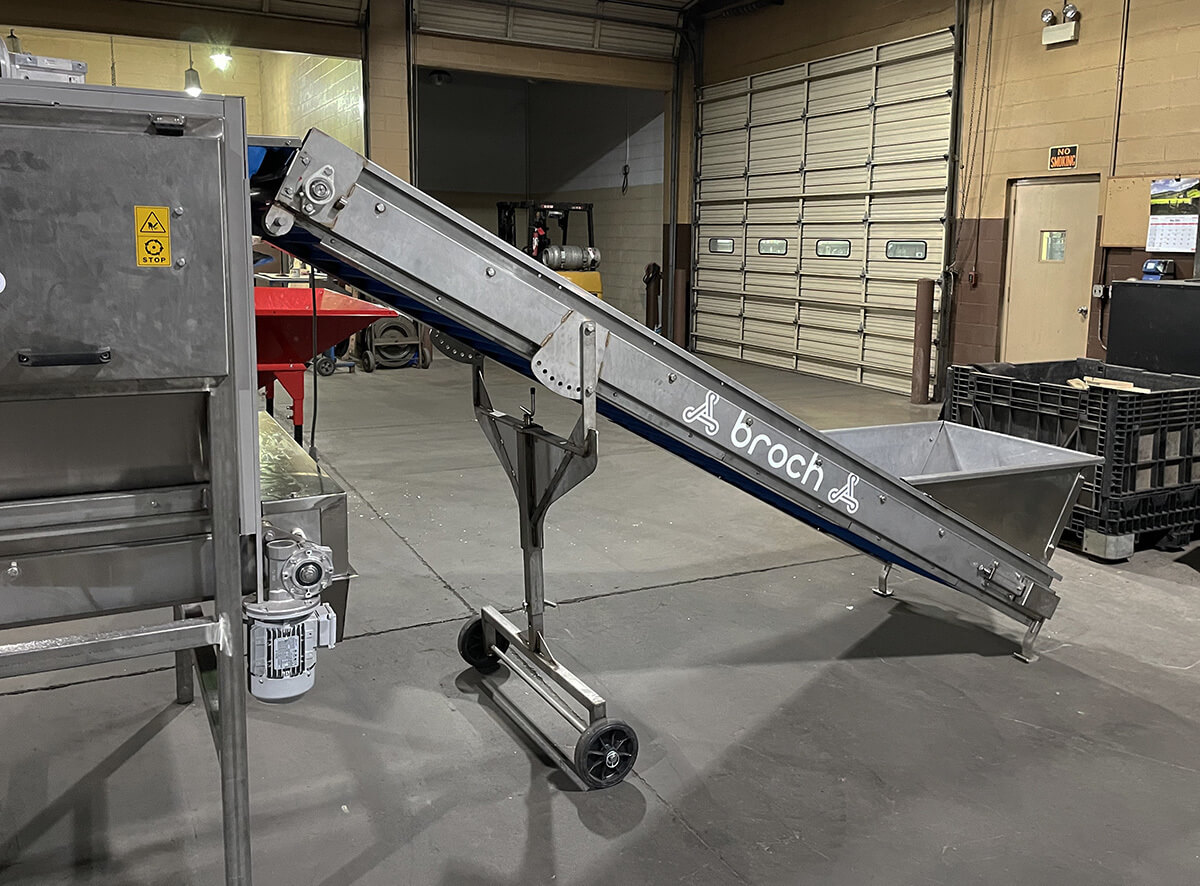 A 42-inch-by-20-inch tapered hopper feeds a 16-inch-wide perforated plastic belt with 2-inch-high cleats on 12-inch centers.