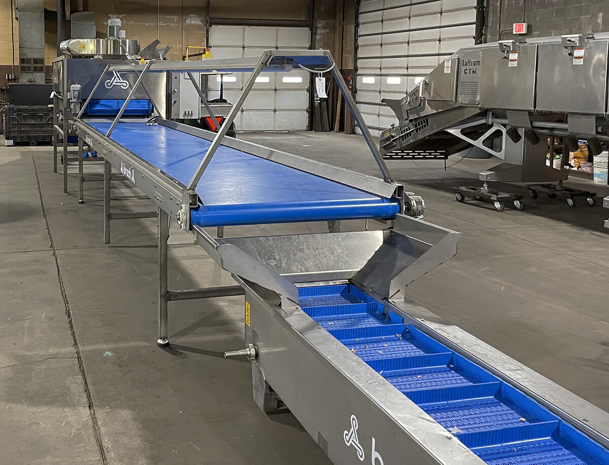 Split cloves fall onto a 33-inch rubber belt with 1.5-inch cleats on 4-inch centers within the chamber.