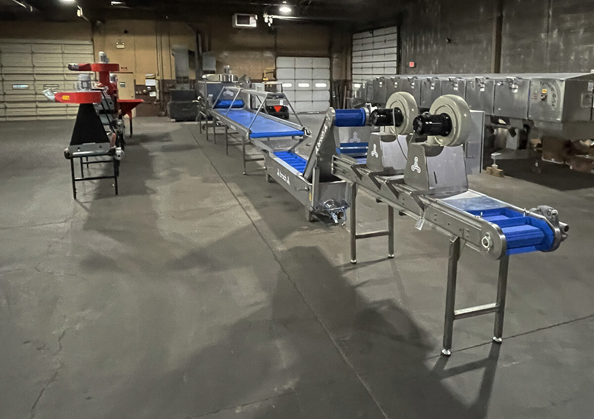The peeler’s infeed end receives trash from a 46-inch rubber belt under the main belt.