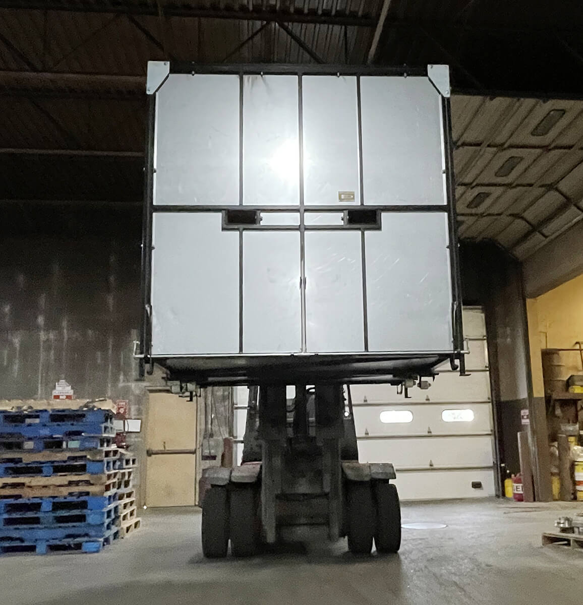 Forklift-liftable and dumpster-mounted.