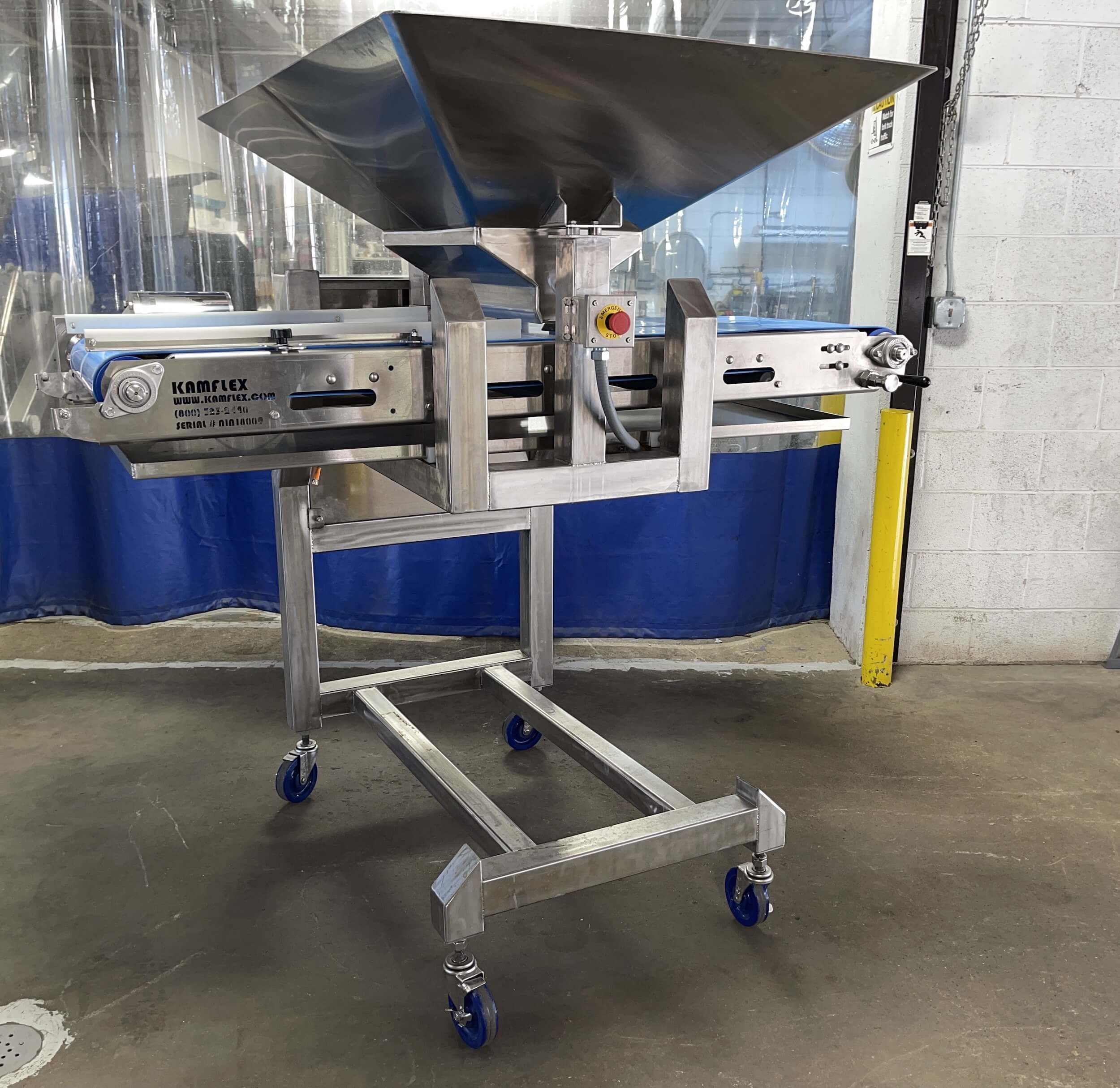 KAMFLEX 372 LF Volumetric Piston Filler. 55″ x 37″ hopper mounted over Inline, model 367F Pump, 316 stainless steel construction, 3″ long x 2.5″ dia. piston, 1/2″ inlet & outlet with sanitary pipe and clamps. Air operated with a foot pedal. Mounted on a tubular stainless steel frame on casters.