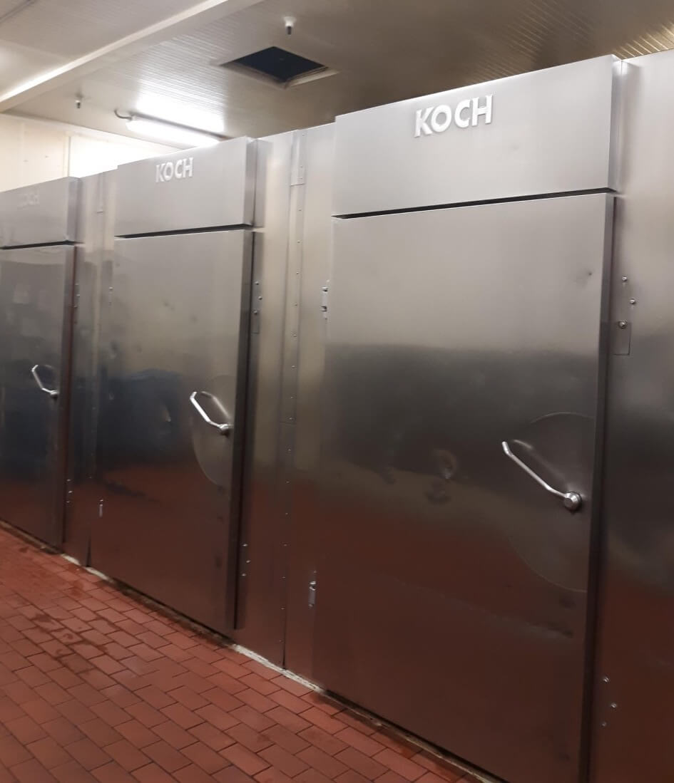 KOCH KLG 400 Smokehouse 2. 1 of (3) Koch Market Master 4 Truck Smokehouses. Stainless steel construction. Micro Processor controls. Two pen chart recorder, Wet & Dry bulb controlled probe. Gas and Steam heating system. Accommodates four deep 44” W x 40” L x 78” H smokehouse trucks (not included). 3 HP fan motor, 220V/3PH/60Hz. Recently removed from production. Each smokehouse dims: 248 x 75.5 x 119 Tall